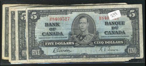 Lot of seven 1937 $5 notes with both signatures. BC-23b and 23c. Grades vary from F to VF.