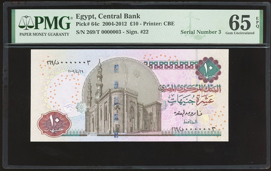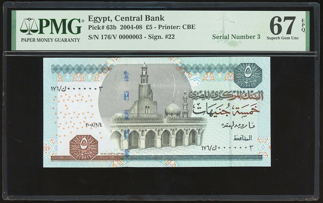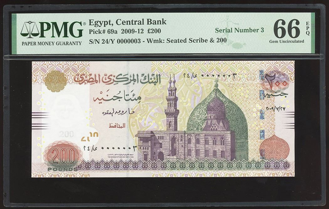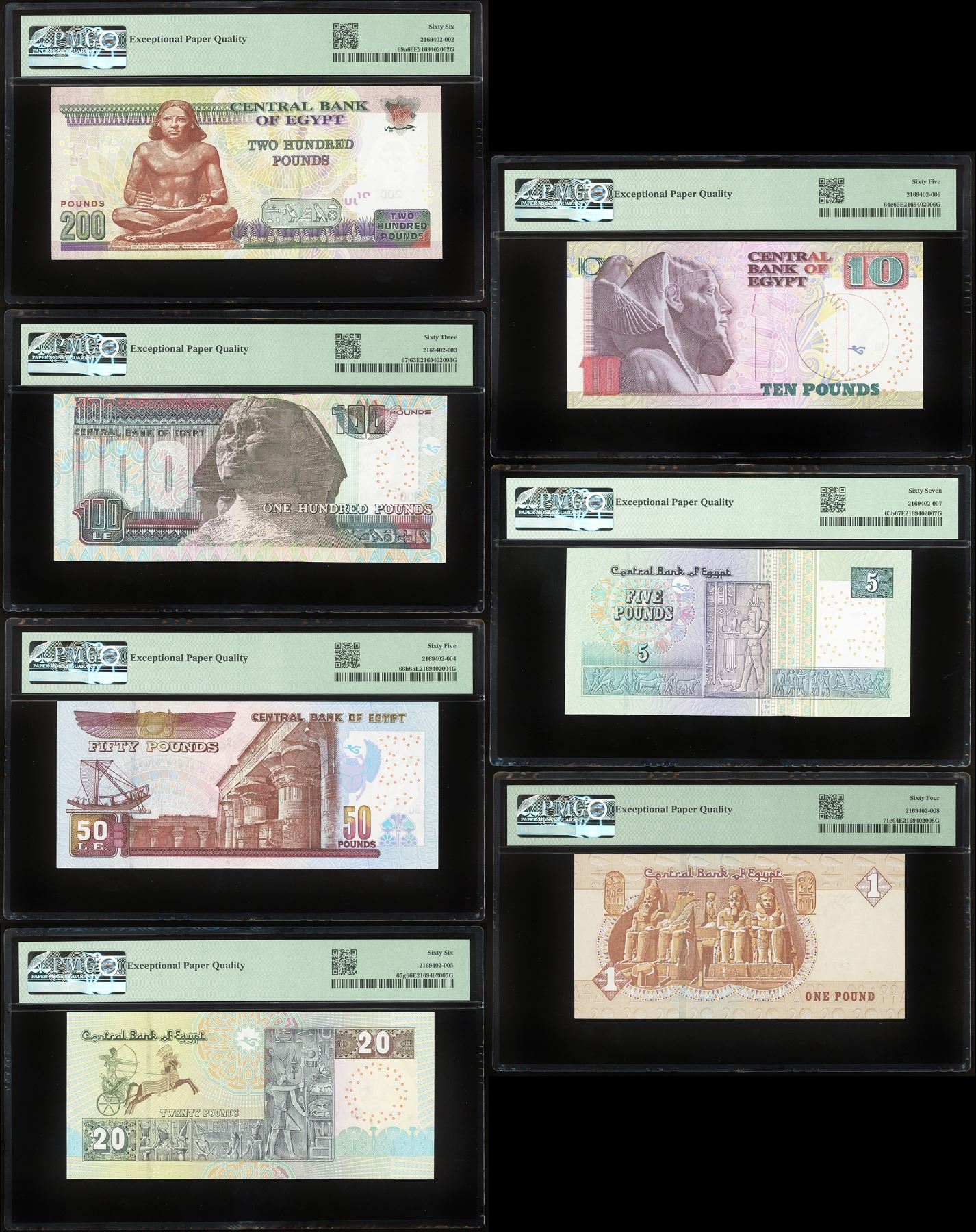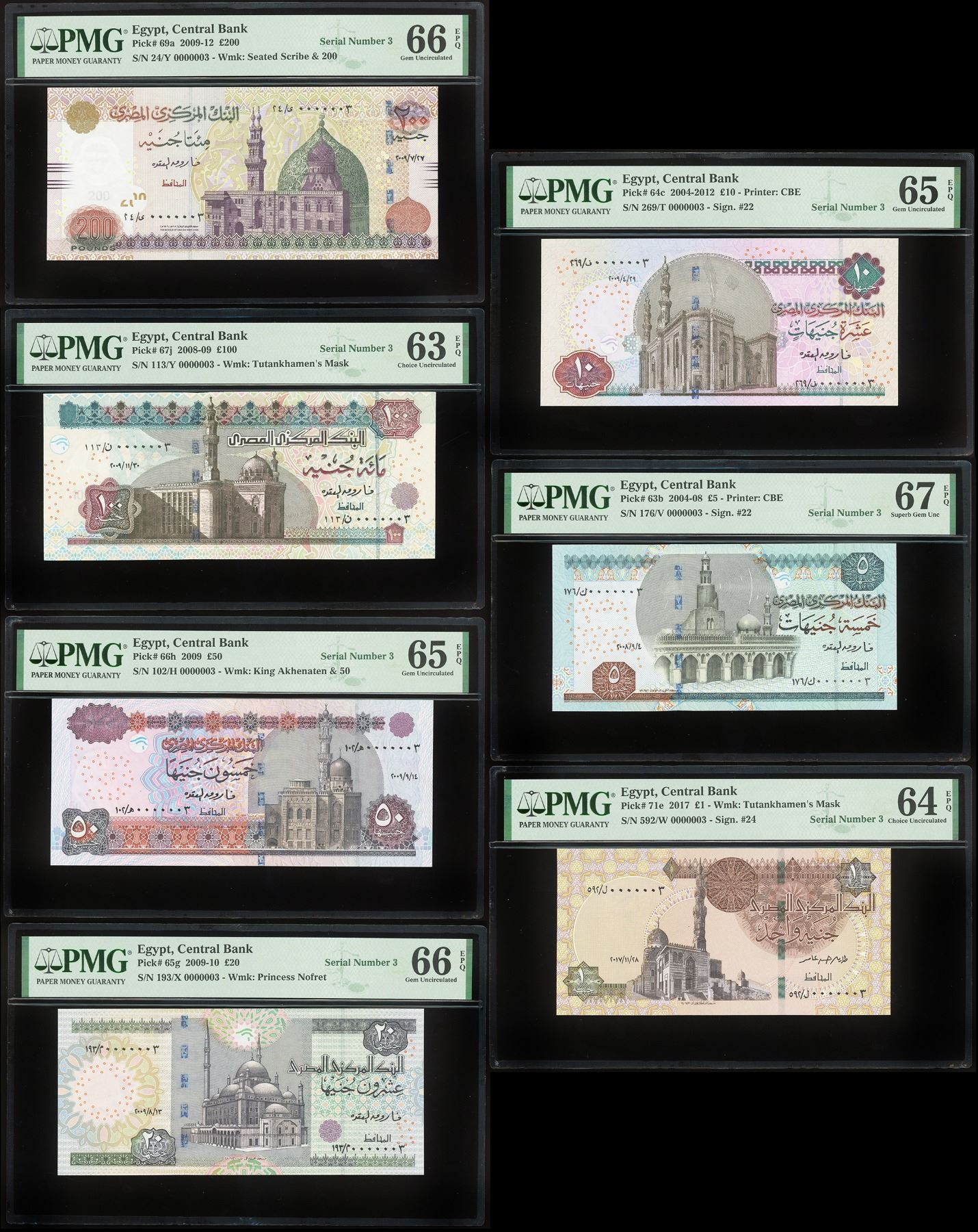 Lot of seven Egypt, Central Bank, notes with very low serial number 3: 200 pounds, 7/27/2009, series 24/Y, PMG Gem UNC 66 EPQ; 100 pounds, 11/30/2009, series 113/Y, PMG Choice UNC 63 EPQ; 50 pounds, 9/14/2009, series 102/H, PMG Gem UNC 65 EPQ; 20 pounds, 8/13/2009, series 193/X, PMG Gem UNC 66 EPQ; 10 pounds, 4/29/2009, series 269/T, PMG Gem UNC 65 EPQ; 5 pounds, 9/4/2008, series 176/V, PMG Gem UNC 67 EPQ; 1 pound, 11/28/2017, series 592/W, PMG Choice UNC 64 EPQ. Desirable denomination set made up of all high-grade, EPQ-designated notes with single digit serial number 3, a feat rarely seen on the market. ${text} Please use this link to verify the certification number[/url]