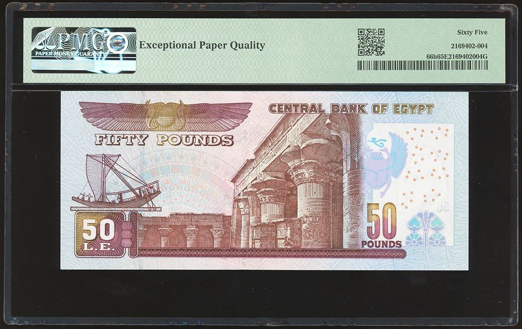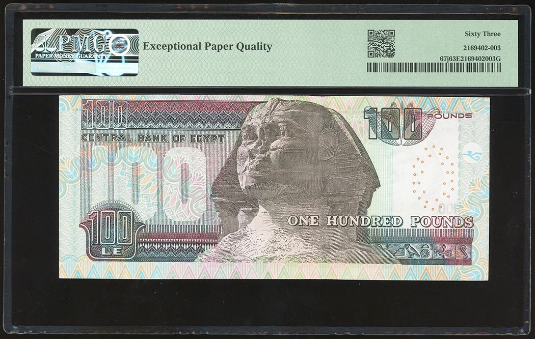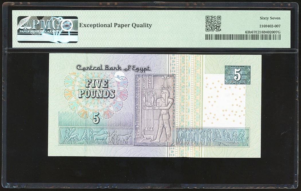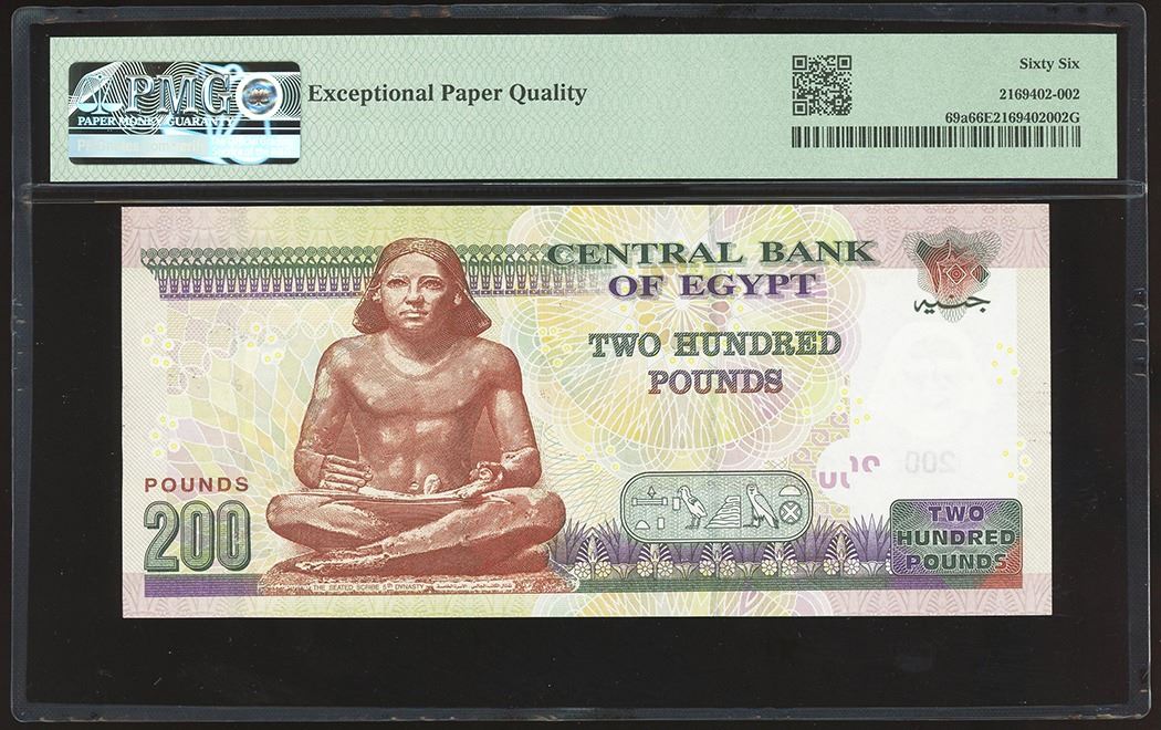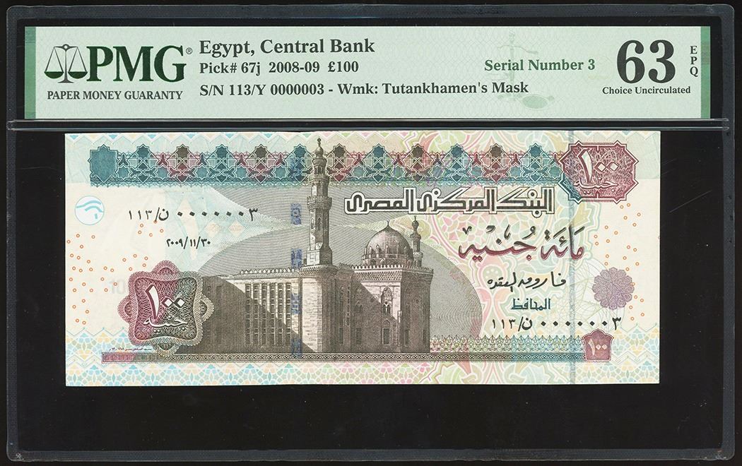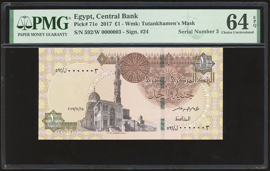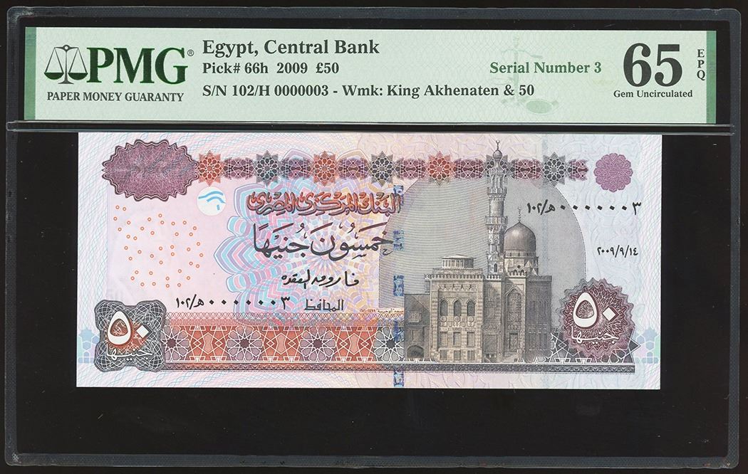 Lot of seven Egypt, Central Bank, notes with very low serial number 3: 200 pounds, 7/27/2009, series 24/Y, PMG Gem UNC 66 EPQ; 100 pounds, 11/30/2009, series 113/Y, PMG Choice UNC 63 EPQ; 50 pounds, 9/14/2009, series 102/H, PMG Gem UNC 65 EPQ; 20 pounds, 8/13/2009, series 193/X, PMG Gem UNC 66 EPQ; 10 pounds, 4/29/2009, series 269/T, PMG Gem UNC 65 EPQ; 5 pounds, 9/4/2008, series 176/V, PMG Gem UNC 67 EPQ; 1 pound, 11/28/2017, series 592/W, PMG Choice UNC 64 EPQ. Desirable denomination set made up of all high-grade, EPQ-designated notes with single digit serial number 3, a feat rarely seen on the market. ${text} Please use this link to verify the certification number[/url]