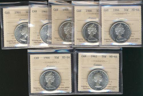 Lot of seven ICCS MS64 CAMEO graded coins. Includes 1961 (2), 1962, 1966 (4). All coins are brilliant.