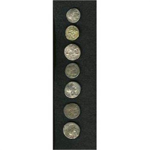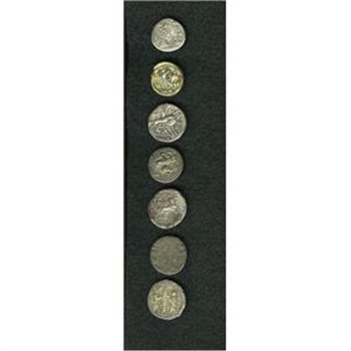<B>Lot of seven Republican silver coins.</B></I> Includes: Anonymous. Victoriatus (2) // Denarii: Pompeius Fostulus // C. Augurinus // Ti. Minucius // P. Maenius Antiaticus // C. Pulcher. <B>Average Fine</B></I> to <B>near VF.</B></I><BR><BR><b>Shipping:</b> Coin/Currency (<a target="_blank" href="http://www.heritageauctions.com/common/shipping.php">view shipping information</a>)