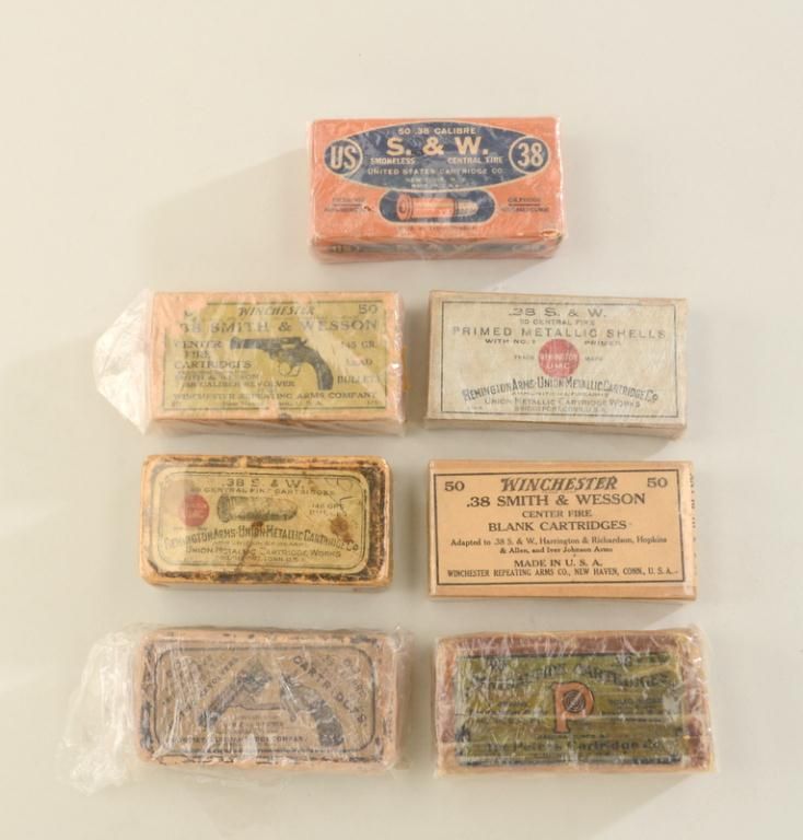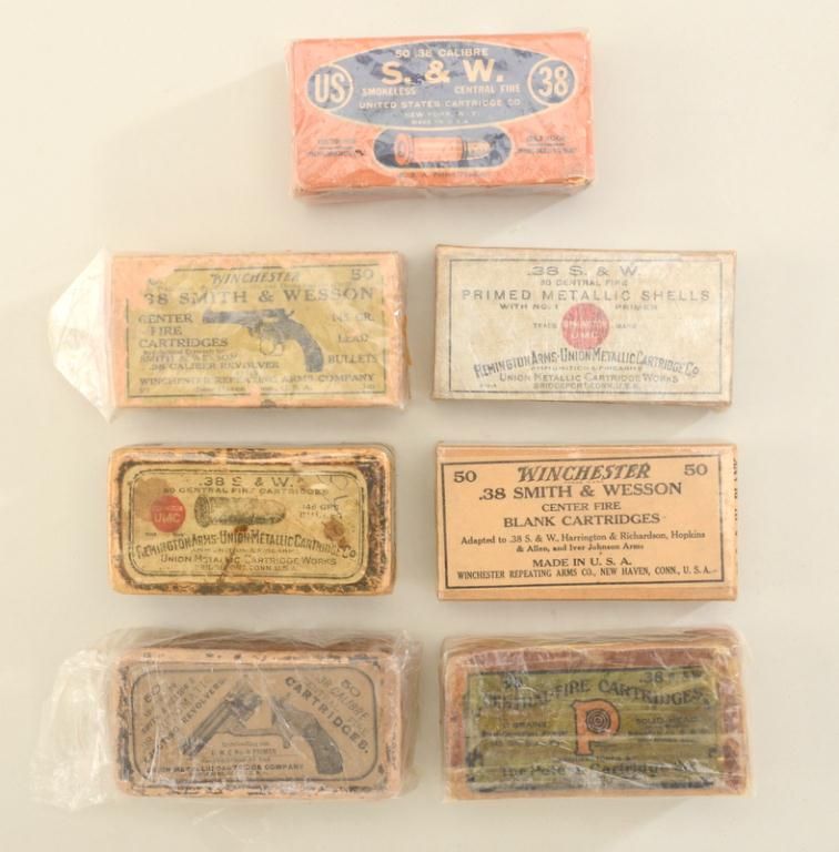 Lot of seven collector’s boxes of ammunition for .38 S&W cal., many appear full, in overall good to very good condition and by makers including Winchester, U.S. Cartridge Co., UMC and Remington/UMC. A nice lot.From the Dr. John Hall Collection. Est.: $200-$300.