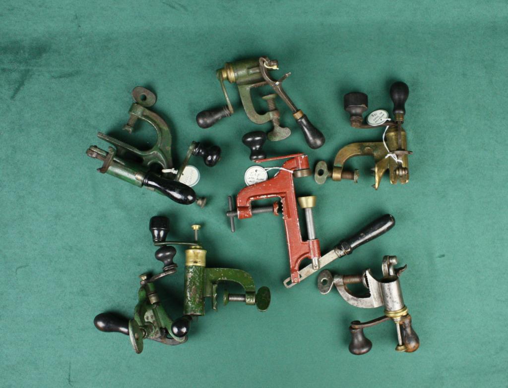 Lot of seven old shotgun reloading tools from an estate, all in overall good condition with considerable original paint on several of them. Est.: $75-$150.
