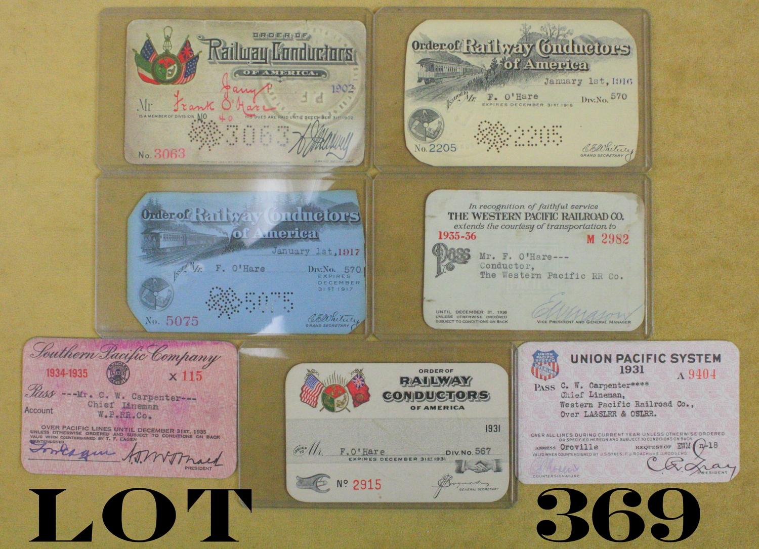 Lot of seven original American Railroad passes including four issued by the Order of Railway Conductors to Frank O’Hare, dated 1902, 1916, 1917 & 1931; a pass from The Western Pacific Railroad Co. to O’Hare forthe years 1935-36 and a 1931 Union Pacific pass for Chief Lineman C.W. Carpenter accompanied by a Southern Pacific pass for 1934-35 also for Carpenter. Colorful early railroad ephemera and all in overall used but good condition. Est.: $50-$75.