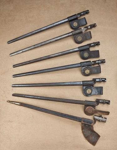 Lot of sevenTrapdoor Springfield bayonets with scabbards and frogs, and one .69 caliber Civil War bayonet with original leather scabbard and brass tip. Civil War bayonet in good condition, leather fair. Trapdoor bayonets range from near fine to good. A nice lot. Est: $750 - $1,500