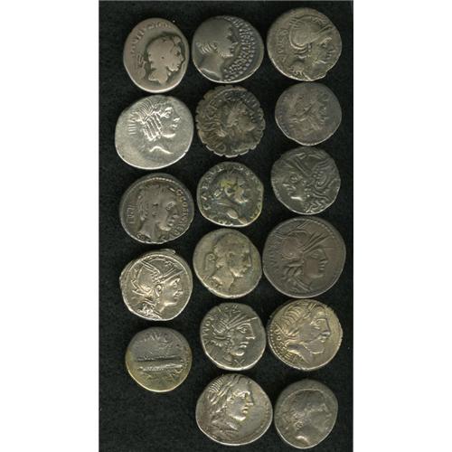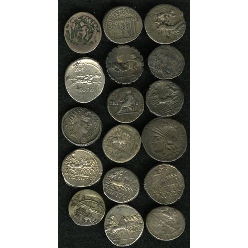 <B>Lot of seventeen AR, mostly denarii.</B></I> Includes: M. Fannius C.f. // Appius Claudius Pulcher, T. Manlius Mancinus, and Q. Urbinius // T. Cloelius. Quinarius // C. Coelius Caldus // L. Calpurnius Piso // L. Rubrius Dossenus // Anonymous // C. Marius C.f. Capito // L. Marcius Philippus 56 (2) // C. Coelius Caldus // Uncertain // Pompey // Mark Antony // Octavian // Republican brockage /// Vespasian. Average Fair to VF.