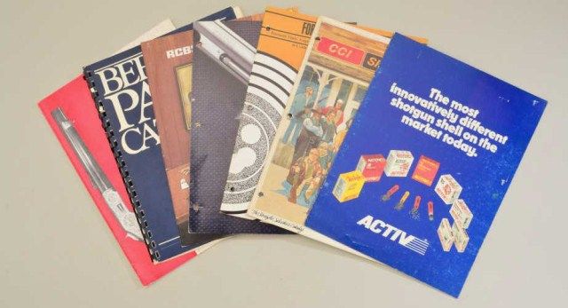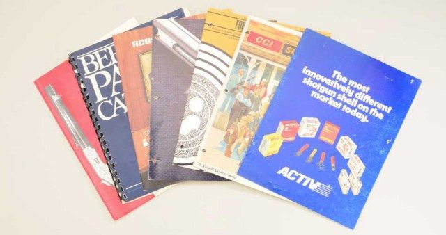 Lot of several dozen gun, gun accessory and sporting goods advertisers, flyers, pamphlets, instructions, etc. including a wealth of information on a variety of makers like Savage, Browning, Winchester, Smith &Wesson, Valmet, H&R, Rossi, Remington, Ruger, Beretta, etc. and accessory companies like Bushnell, L.L. Bean, Speer, RCBS, etc.; a wealth of info. and great for the gun show circuit. Est.: $100-$150.