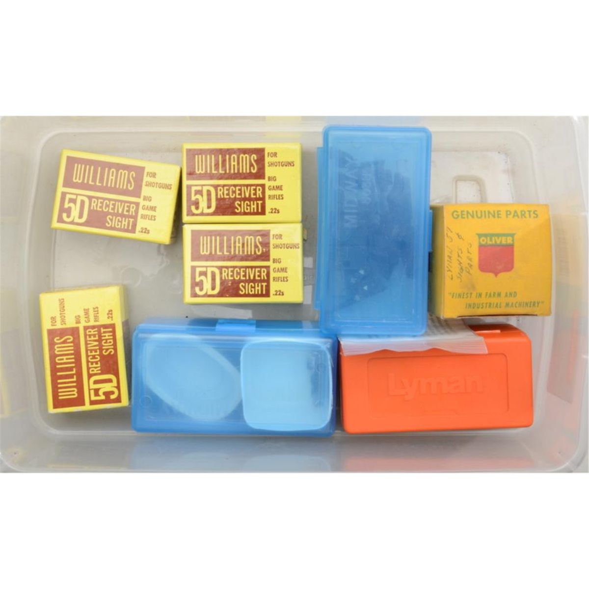 Lot of sights including four Williams receiver sights in factory boxes; a Lyman adjustable tang sight in like new condition; a Ruger peep sight plus a number of misc. sight parts and screws. Est.: $50-$100.
