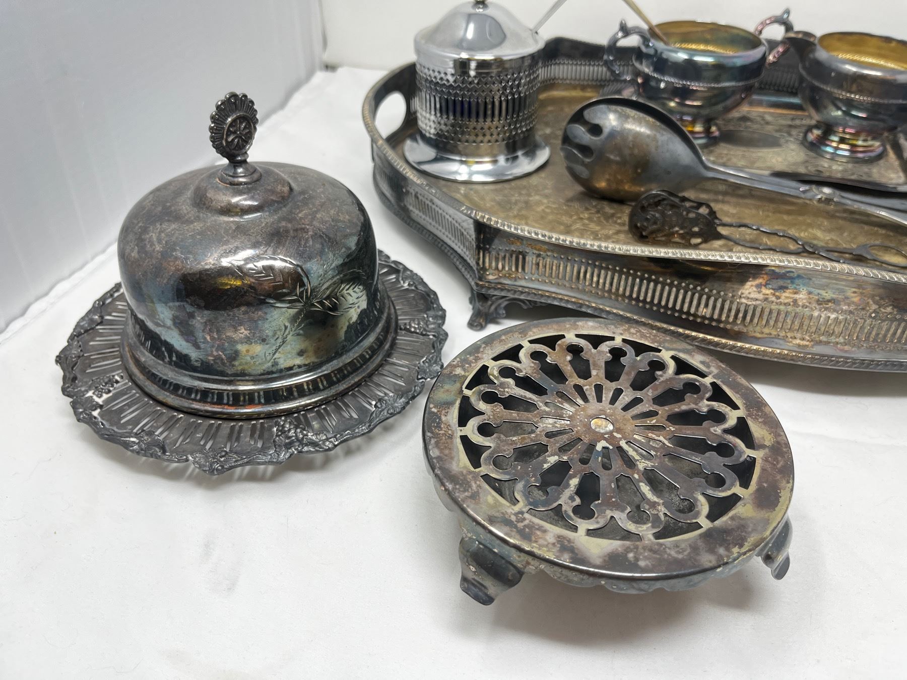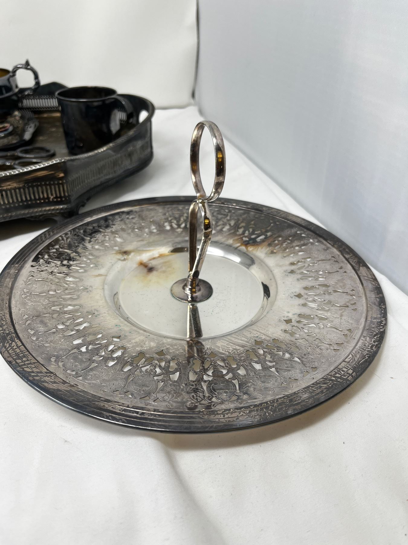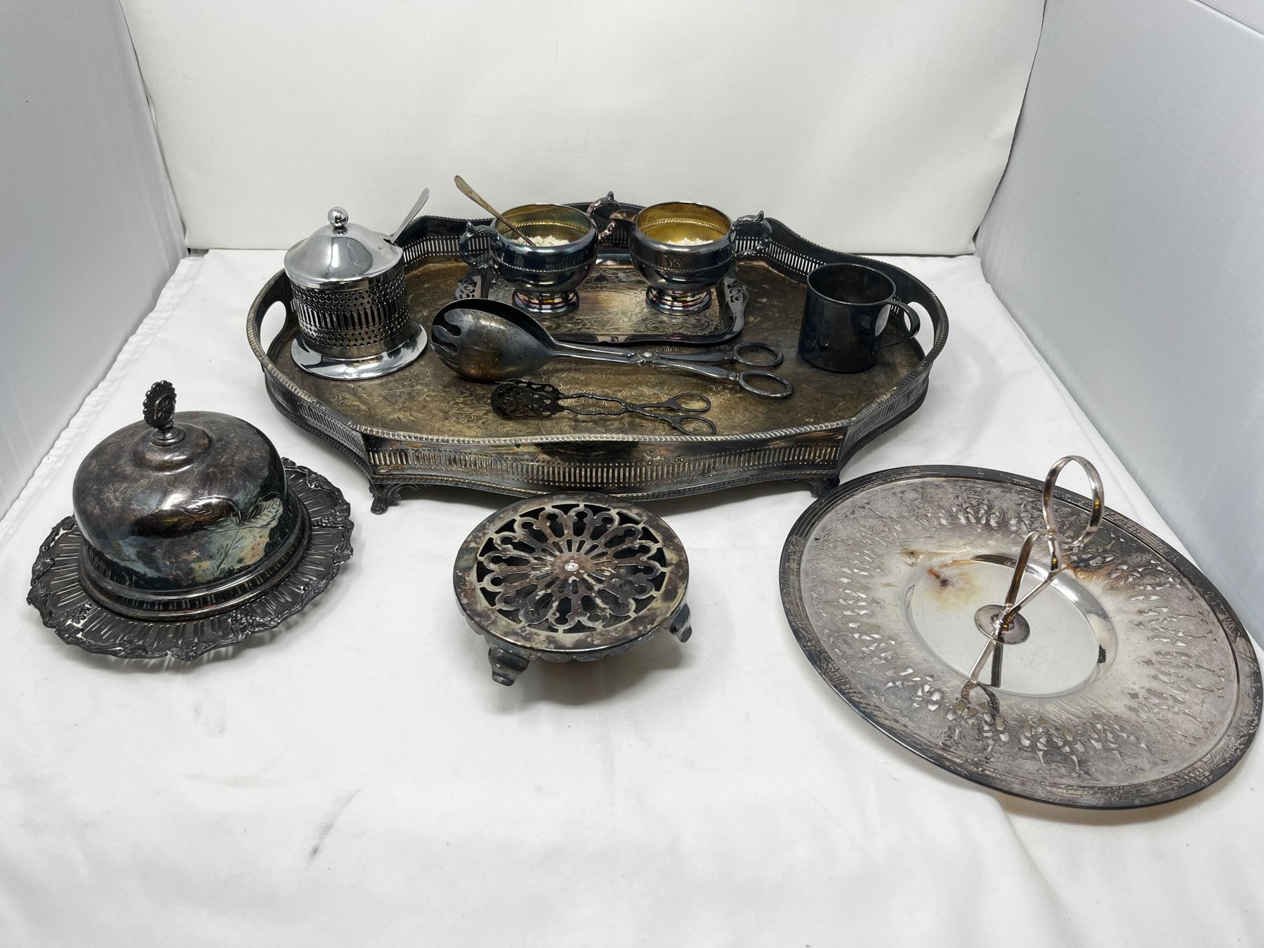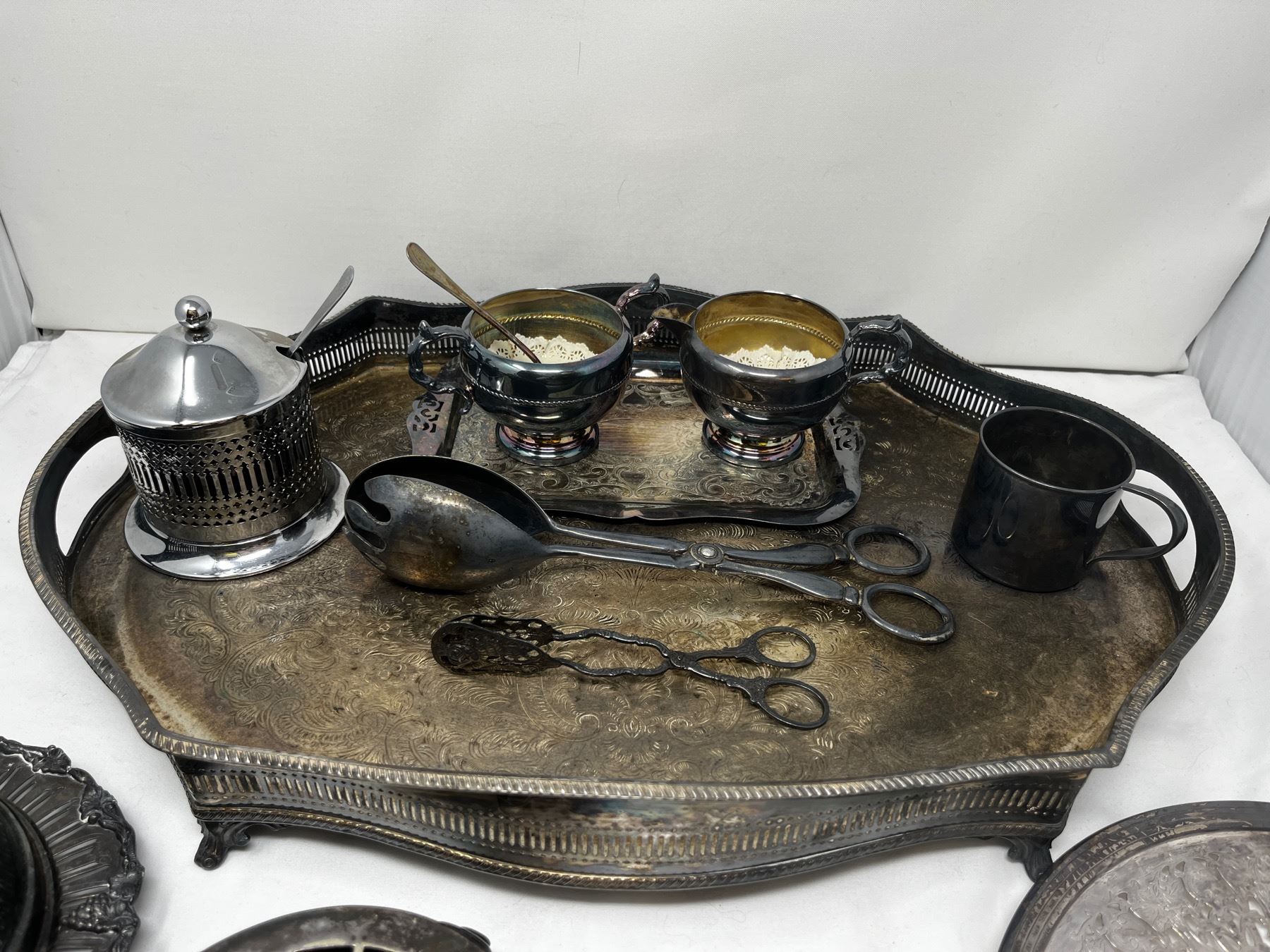 Group lot of various trays bowls and utensils all silver plate from various manufacturers.