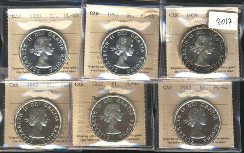 Lot of six ICCS Proof-like graded silver dollars. Includes a 1959 PL64, 1960 PL65 CAMEO (2), 1962 PL64 CAMEO, 1962 PL64 HEAVY CAMEO and a 1962 PL65 CAMEO.