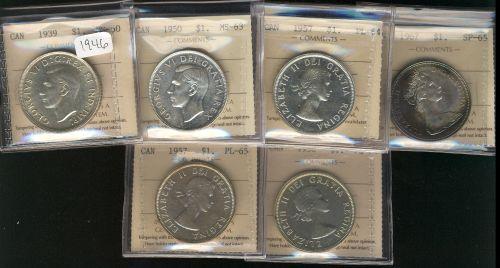 Lot of six ICCS graded silver dollars. Includes a 1939 MS60, 1950 MS63, 1957 PL64, 1957 PL65, 1958 PL64 and a 1967 SP65. Only the 1967 dollar has some toning all the others are brilliant.