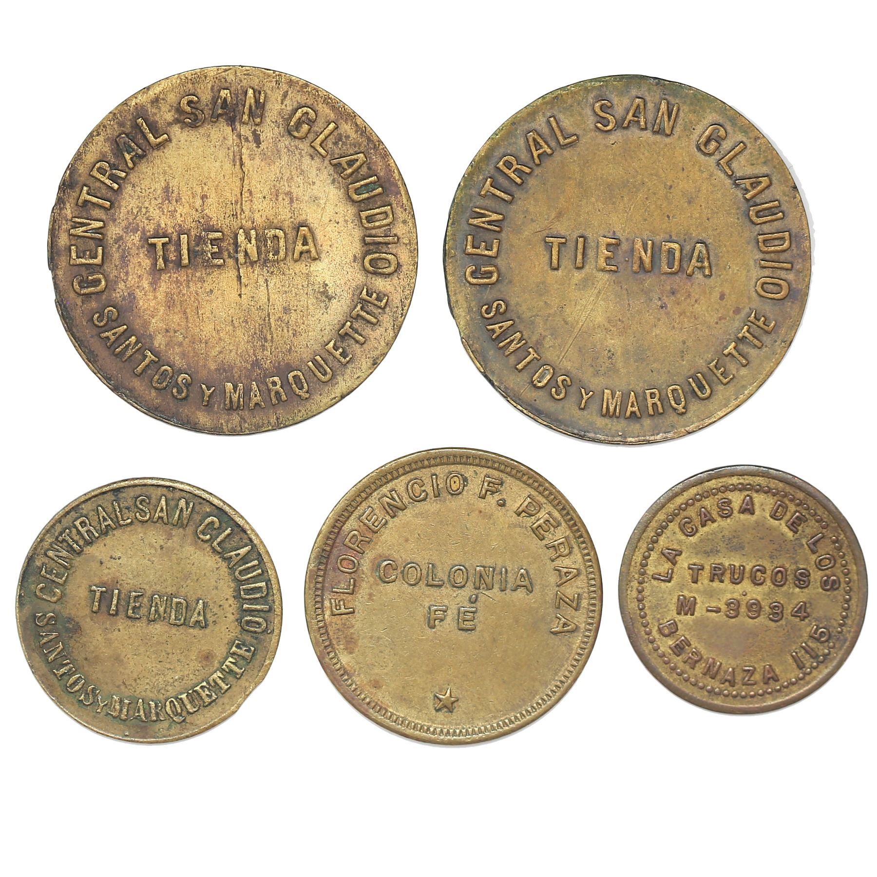 Lot of six bronze Cuban tokens. 25.35 grams total. Several scarce types in this group including a nice Central San Claudio issue, generally VF to AU.