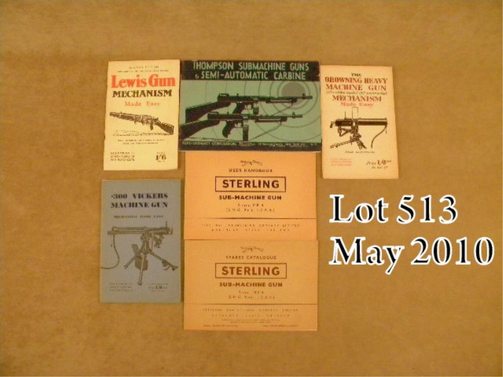 Lot of six original machine gun illustrated manuals all in very good condition. 1. “The Browning Heavy Machine Gun .300 caliber Model 1917 (water cooled)” by Gale & Polden Limited (original price: One Shilling and Sixpence; 2)“The Lewis Gun”, also by Gale & Polden Limited with notes on the .300 (American) Lewis Gun including a color foldout showing all parts; 3) “The .300 Vickers Machine Gun” by Gale & Polden; 4) & 5) Two catalog set for the SterlingSub-Machine Gun 9mm. MK 4 (S.M.G. 9mm. L.2.A.3.) including a User Handbook and a Spares Catalog; 6) 1936 dated Auto-Ordnance Corp. manual for the Thompson Submachine Guns & Semi-Automatic Carbine. A grouping of hard-to-find early manuals. Est.: $100-$200.