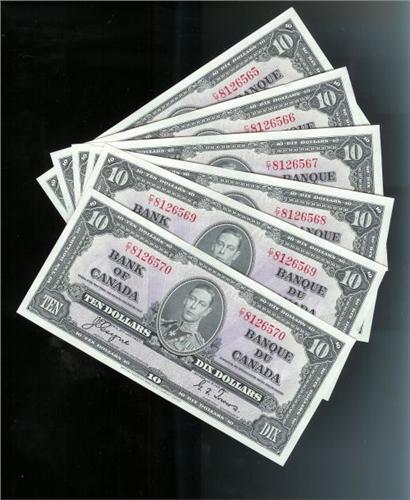 Lot of six sequential notes. BC-24c 1937 $10 Coyne-Towers C/T8126565/570. Original CHOICE uncirculated.
