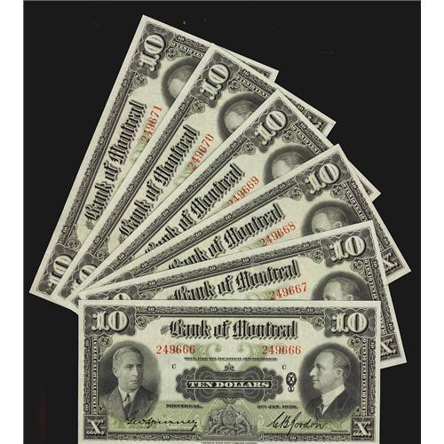 Lot of six sequential notes. Bank of Montreal 1935 $10 505-62-04. No.249666 to 249671. All notes are original Unc. To Choice Unc.
