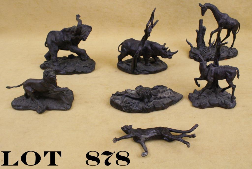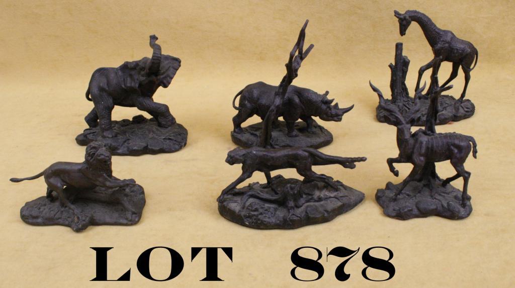 Lot of six small bronze African animals, each approx. 5” to 6” in height and approx. 3” to 5” overall and showing dark patina to metal surfaces; includes a rhino, a giraffe, an ibex, a lion, an elephant and a cheetah; allin good condition except cheetah that needs to be re-attached to its base (easily done). Est.: $300-$500.