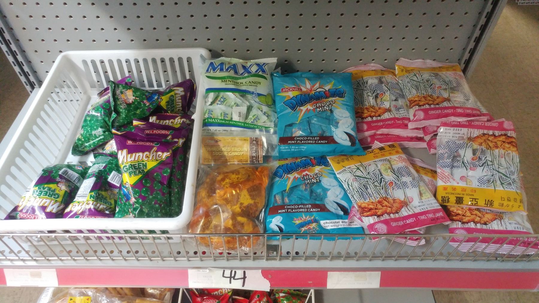 Lot of snacks (green peas, chocolate mints, ginger candy)