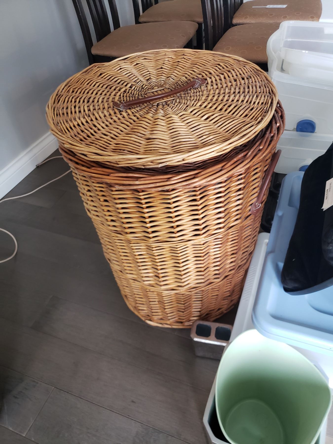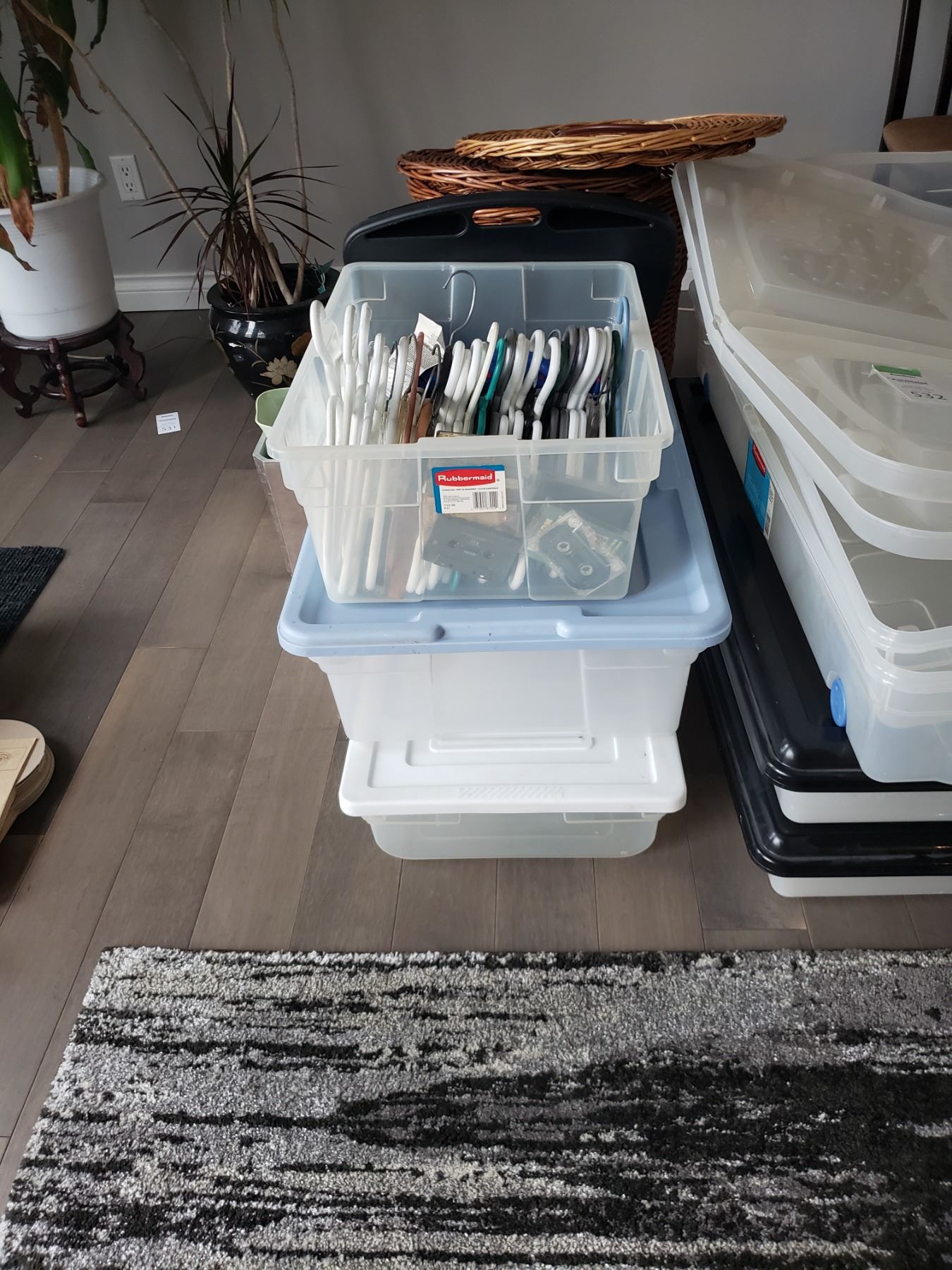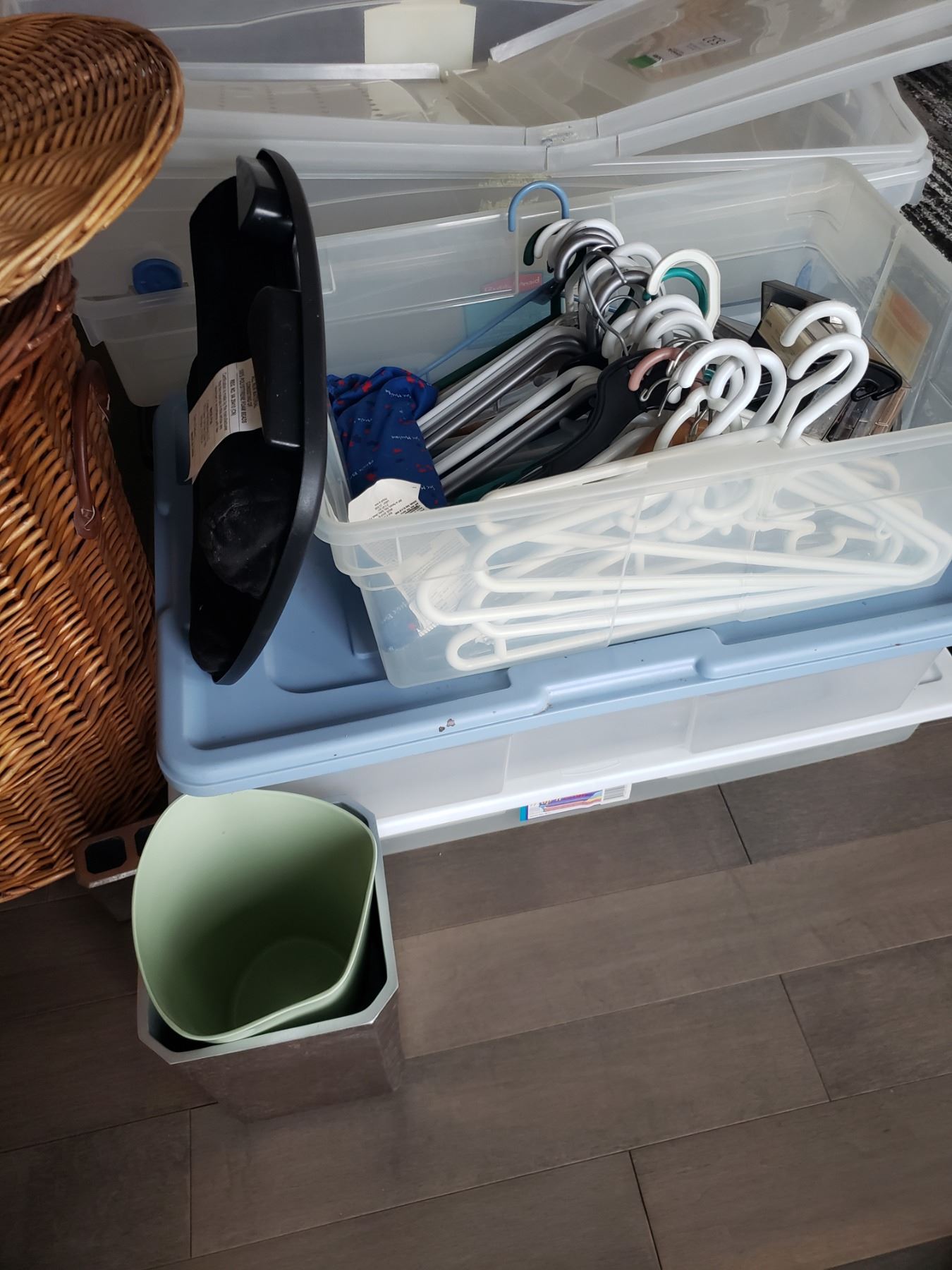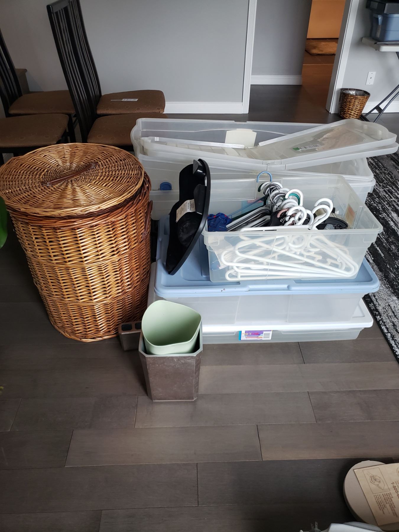 6 rubbermade totes, wicker laundry bin and assorted household items. Pickup between 9-10am.