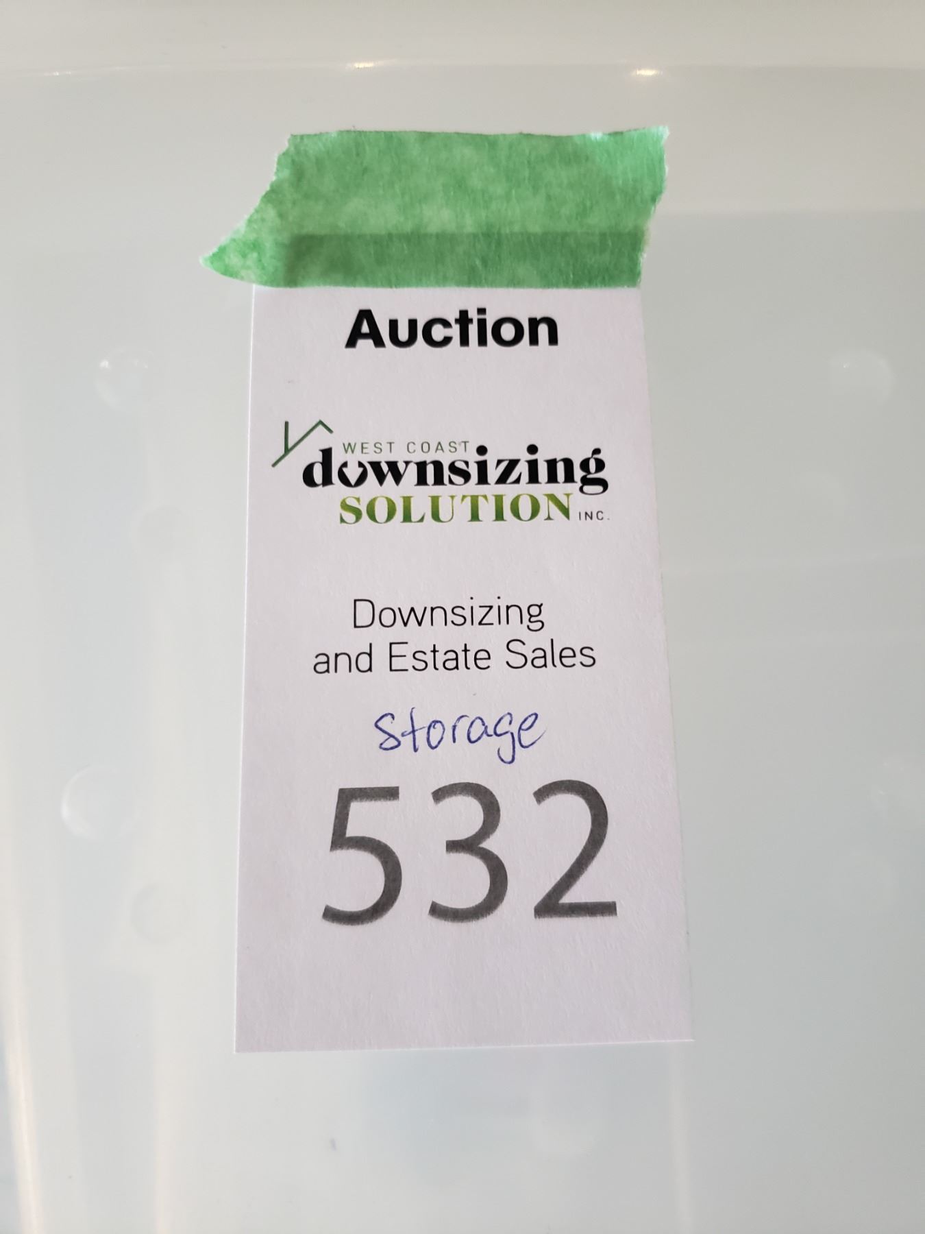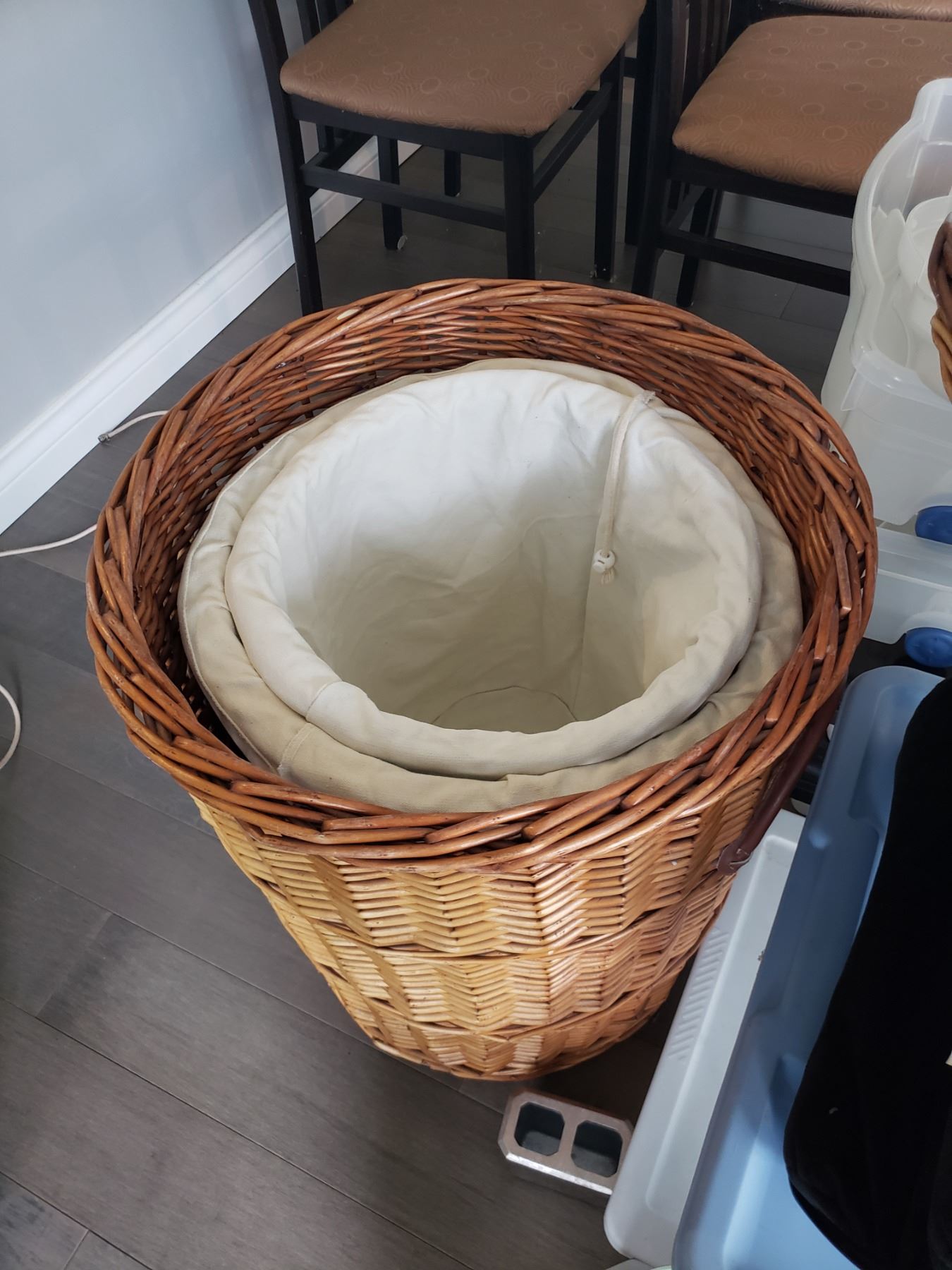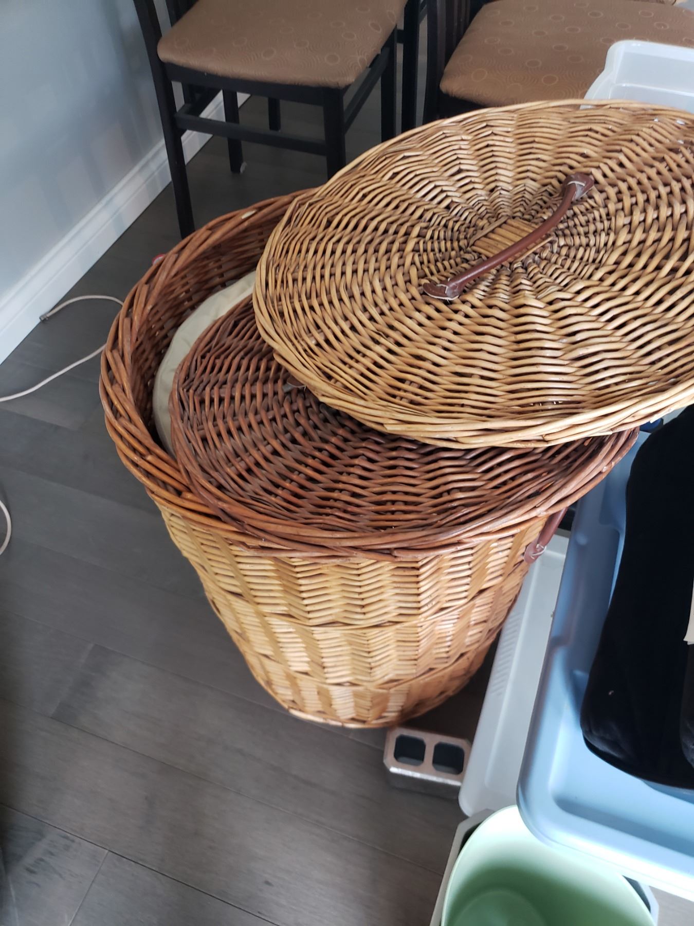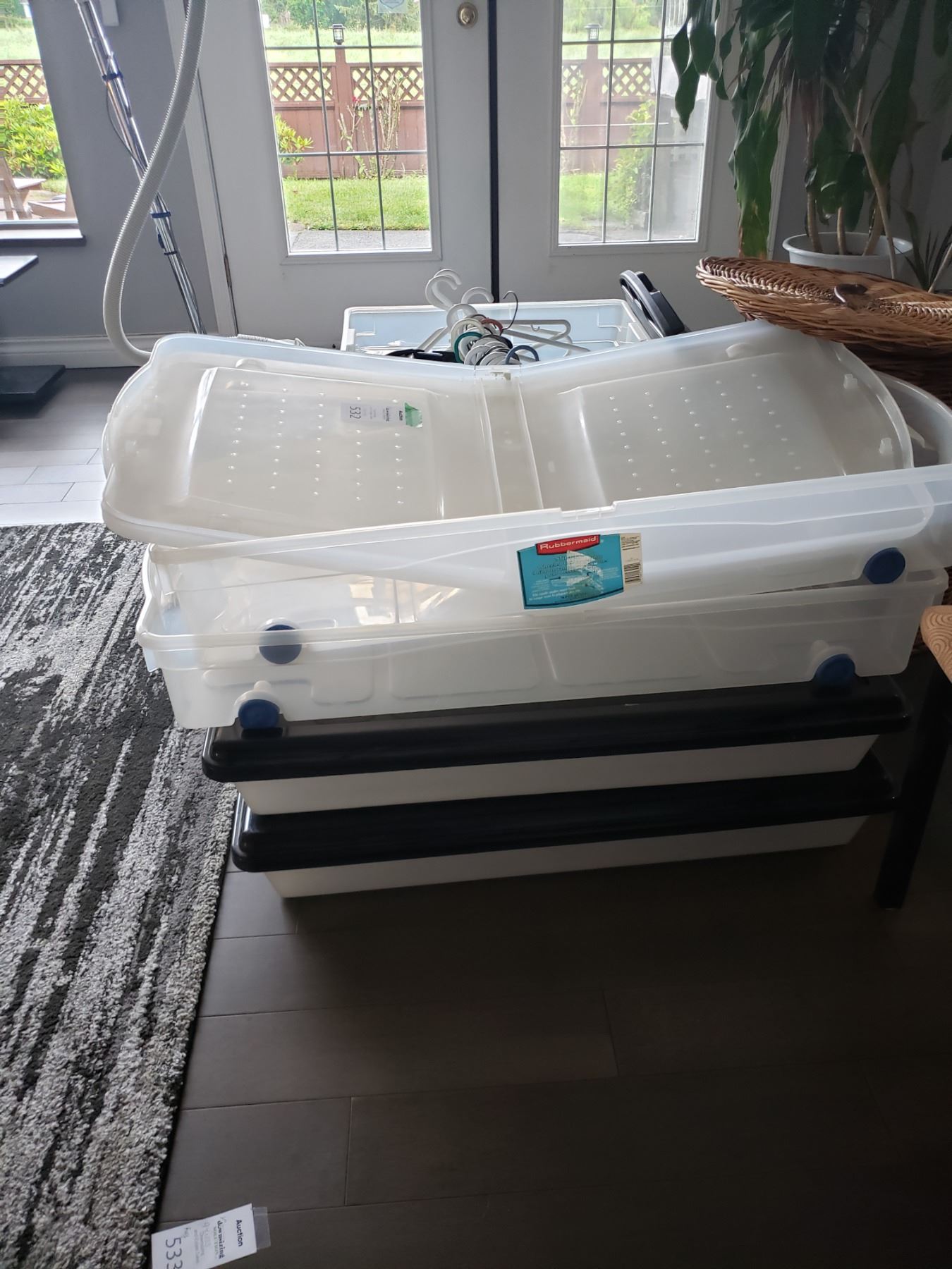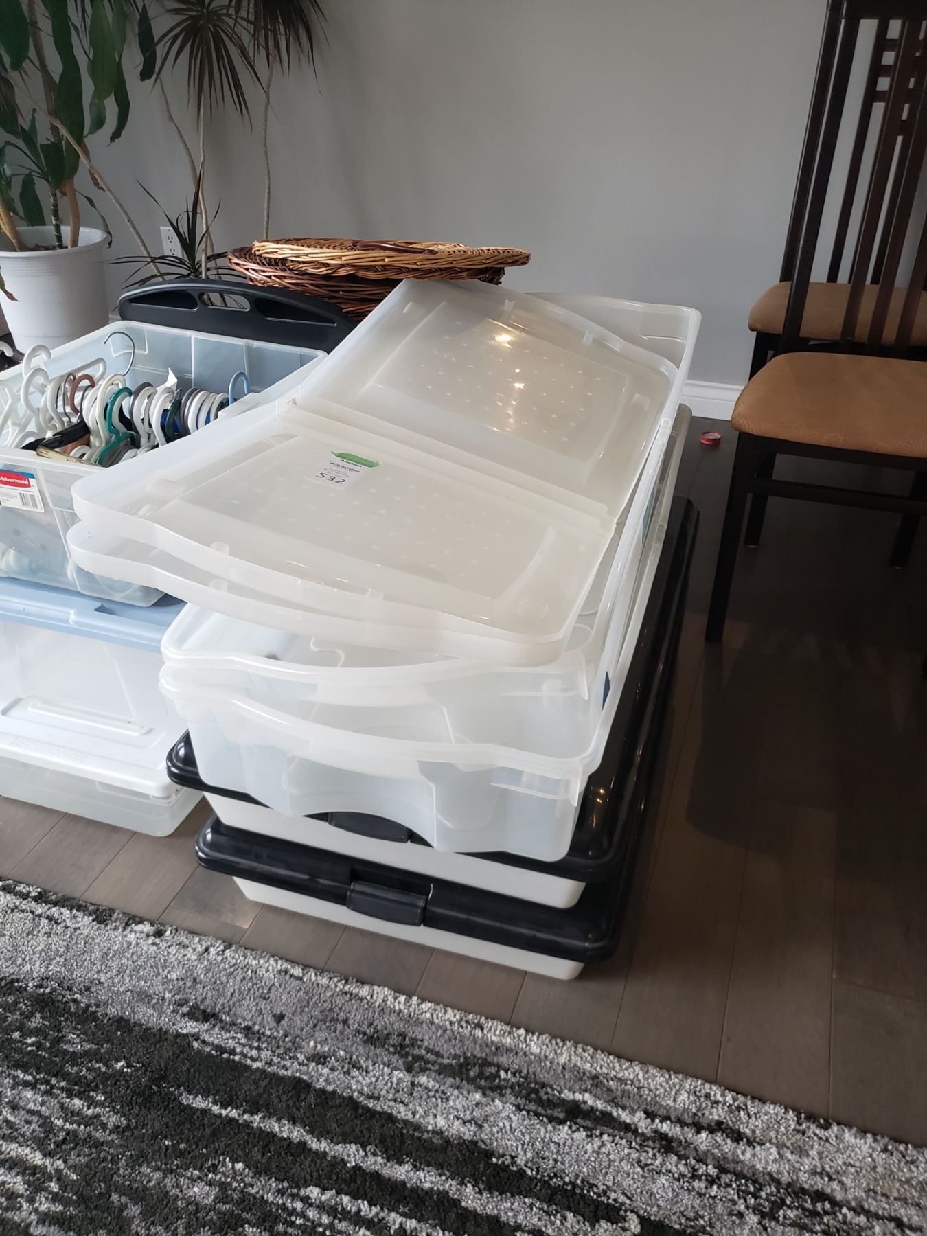 6 rubbermade totes, wicker laundry bin and assorted household items. Pickup between 9-10am.