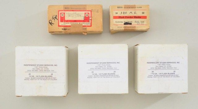 Lot of studio prop blank ammo including a box of .223 flash powder blanks by Stembridge Gun Rentals and a box of .380 M.G. Flash Powder Blanks, also by Stembridge; plus three boxes of 12 gauge shot blanks, two boxes are ¼ flash, the other box is ½ flash. Est.: $25-$50.
