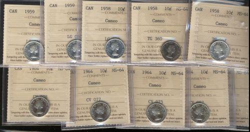 Lot of ten ICCS MS64 CAMEO graded coins. Includes 1958 (3). 1959 (2), 1964 (4), 1968 Silver. A couple pieces are toned.