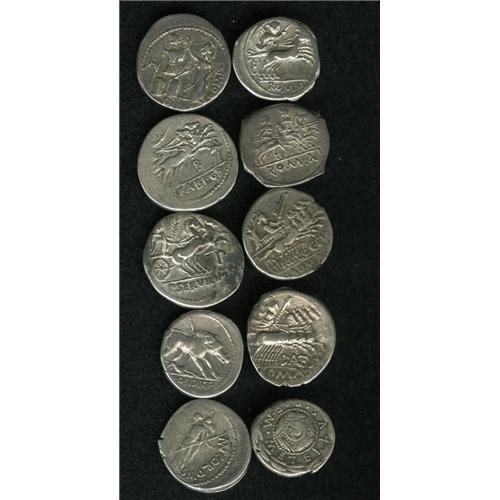 <B>Lot of ten Republican denarii.</B></I> Includes: Anonymous (2) // C. Curiatius Trigeminus // L. Antestius Gragulus // M. Caecilius Q. f. Q. n. Metellus // M. Furius L. f. Philus // C. Fabius C. f. Hadrianus // P. Servilius M. f. Rullus // C. Hosidius C. f. Geta // Mn. Cordius Rufus. Average Fine to VF. Ten (10) coins in lot.