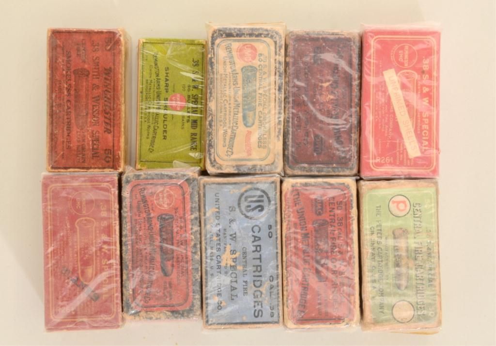 Lot of ten collector’s boxes of .38 S&W Special ammunition, several full, others are partially full, each different and ranging in condition from fair to very good; makers include Peters, UMC, Remington/UMC, U.S.Cartridge Co. and Winchester; a neat lot. From the Dr. John Hall Collection. Est.: $300-$600.