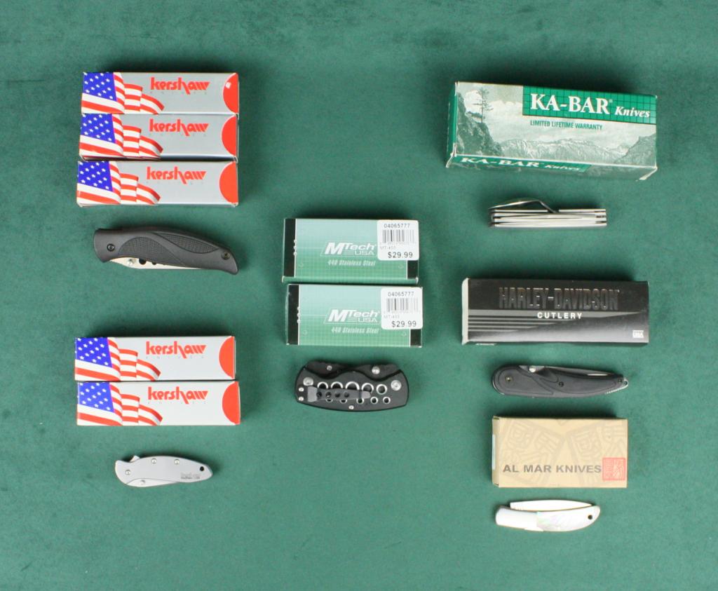 Lot of ten folding knives in their factory boxes including a KA-BAR Hobo Outdoor Diner model with carry pouch, two Kershaw Model 1600 Chive knives, two Kershaw Model 1560ST Whirlwind knives, one Kershaw Model 1550STBlack Out knife, two MTech Model 440 stainless steel knives, and Al Mar knife and a Harley-Davidson Cutlery knife. Est.: $75-$150.