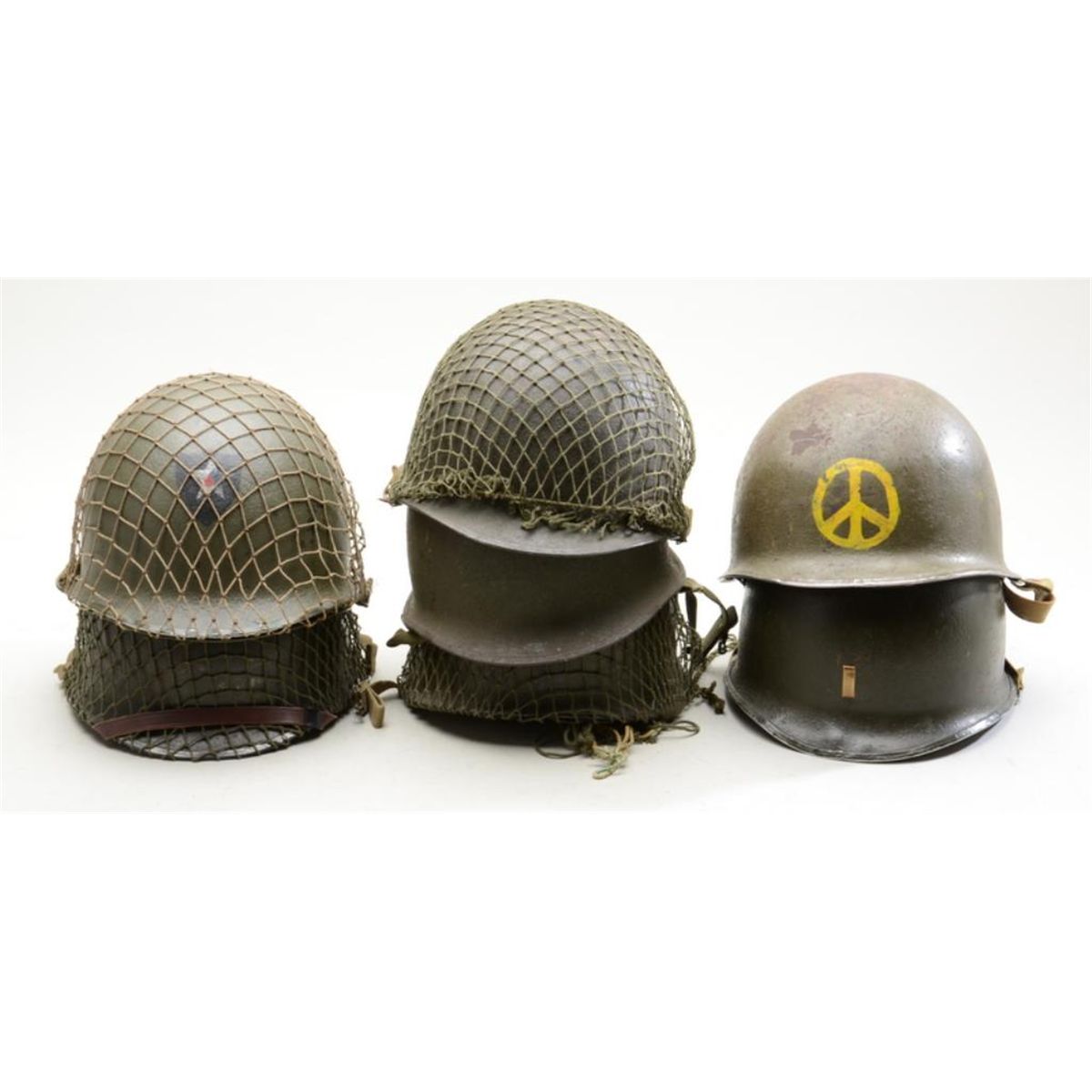 Lot of ten misc. military helmets, most with liners; U.S. armed forces, mostly WW II and Korea eras; some with tags giving additional info. by Dr. Fenn. From the Dr. Sterling Fenn collection. Est.: $350-$650.