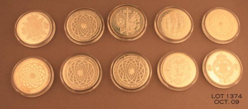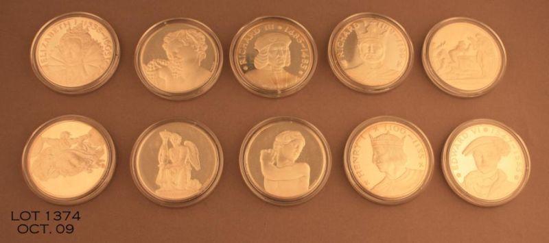 Lot of ten one Troy ounce rounds with historic  scenes and people including Edward VI, Elizabeth  I, Richard III, Henry I, etc. all in fine  condition and each in a plastic protective casing.   Est.:  $200-$400.