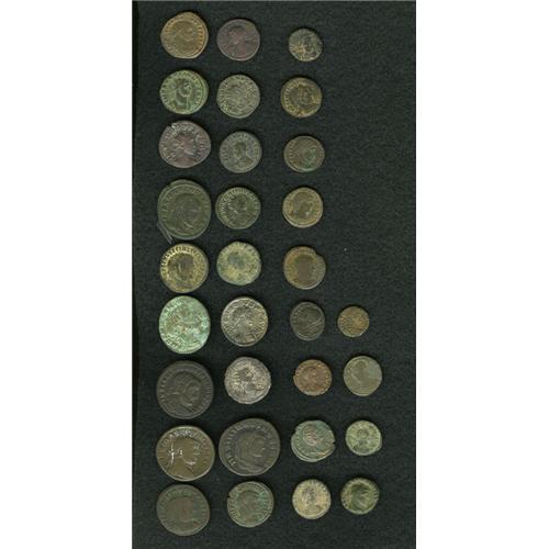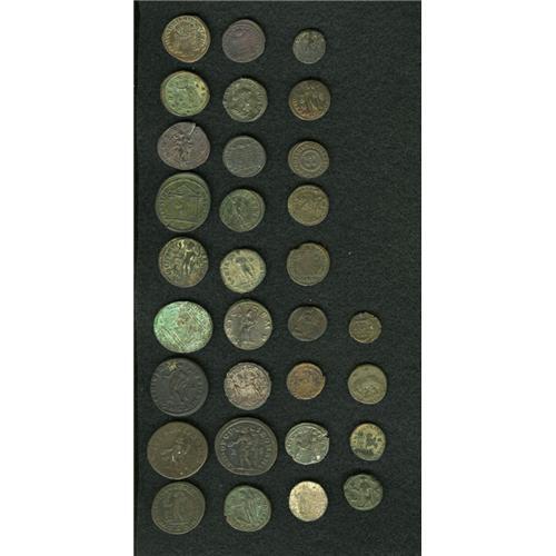 <B>Lot of thirty-one bronzes, mostly late Roman.</B></I> Includes: Egypt, Alexandria. Aurelian // Salonina // Aurelian // Aurelian and Vaballathus // Probus (3) // Numerian // Maximianus (2) // Galerius (2) // Maxentius (2) // Licinius I (3) // Constantine I (3) // Crispus // Constantine II (2) // Constantinopolis // Urbs Roma // Gratian // Theodosius I // Arcadius (3) // Honorius. <B>Average Fair</B></I> to <B>Fine,</B></I> a few better.<BR><BR><b>Shipping:</b> Coin/Currency (<a target="_blank" href="http://www.heritageauctions.com/common/shipping.php">view shipping information</a>)