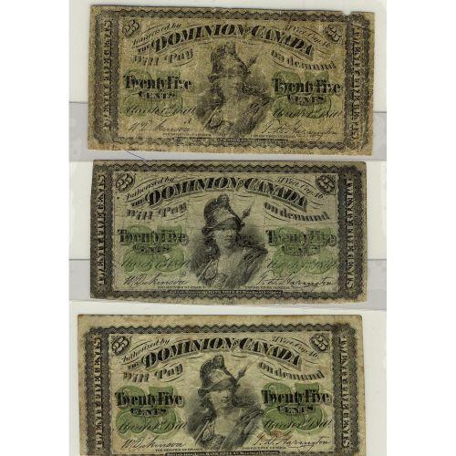 Lot of three 1870 25 cents DC-1a, G-6, DC-1b VG-F, DC-1c F-15.