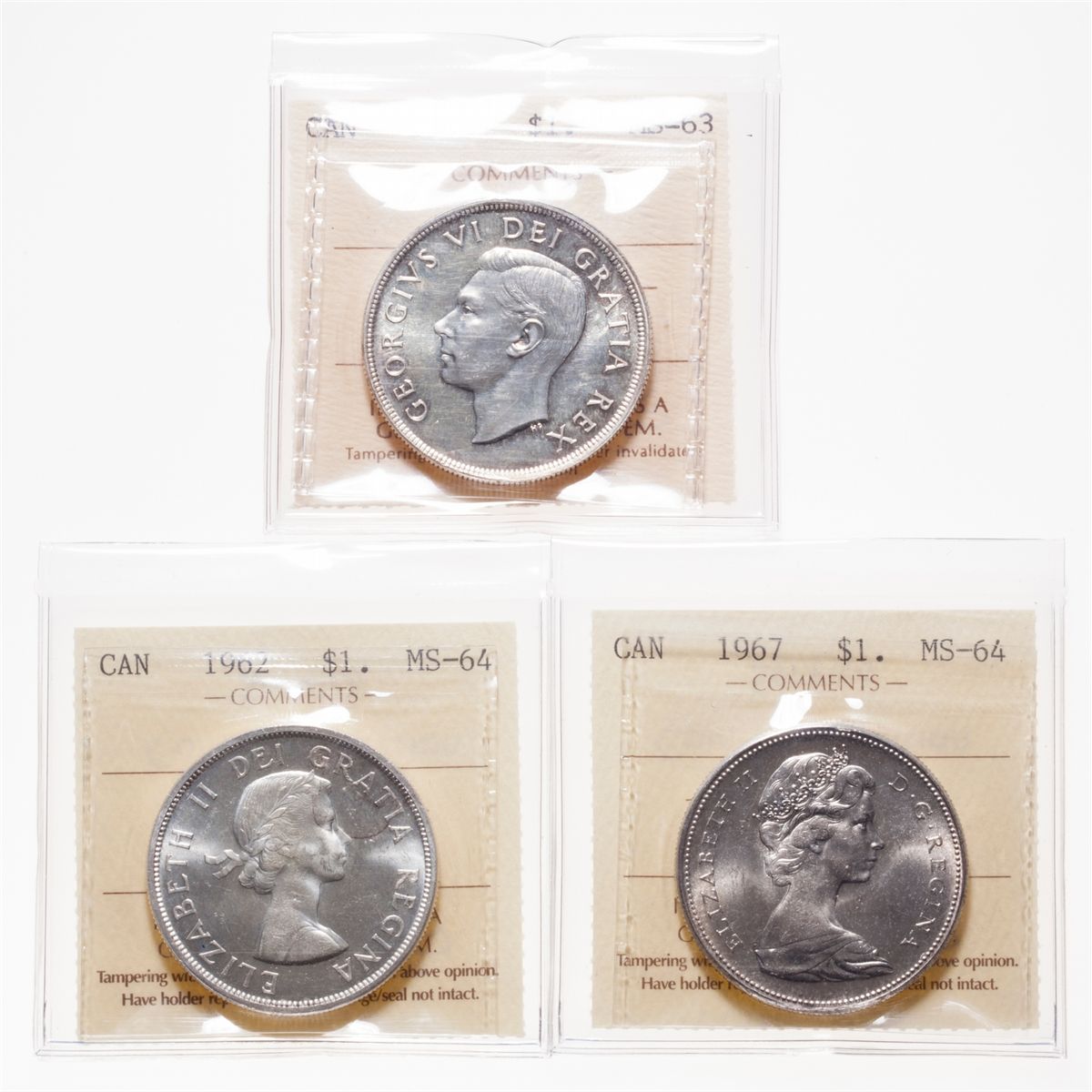 Lot of three (3) ICCS graded Silver Dollars, including: 1949 MS-63; 1962 MS-64; 1967 MS-64.