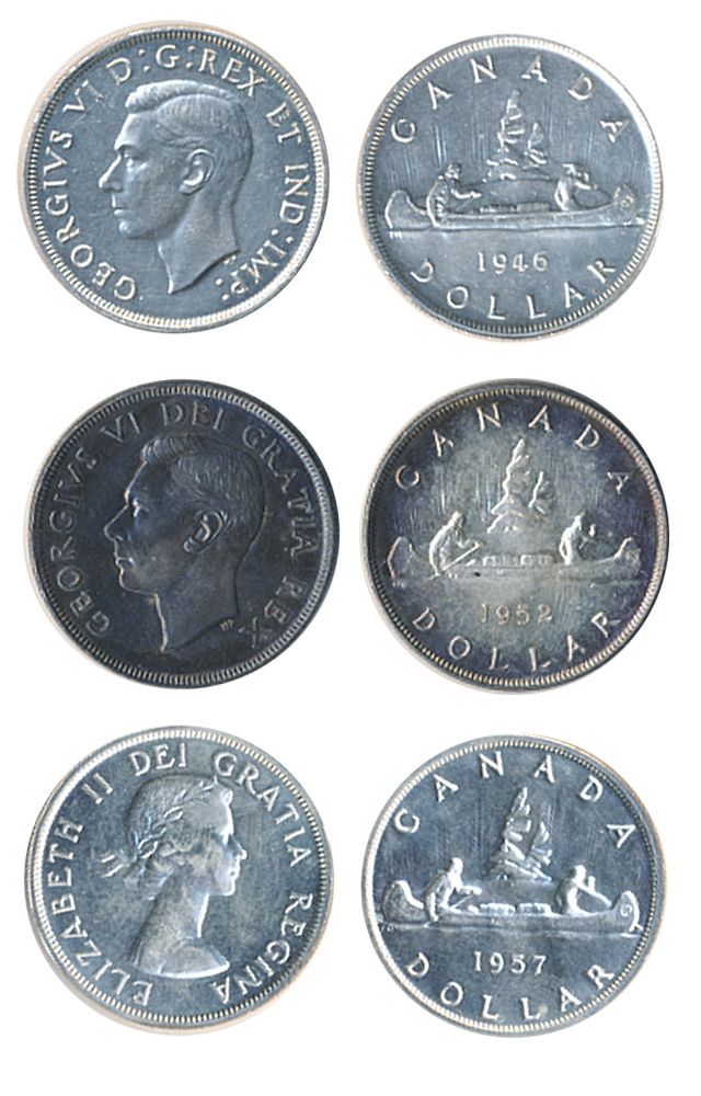 1946. Extra Fine-40; 1952, NWL. Unc-63; 1957. Proof-Like-64. Lot of three (3) dollars.