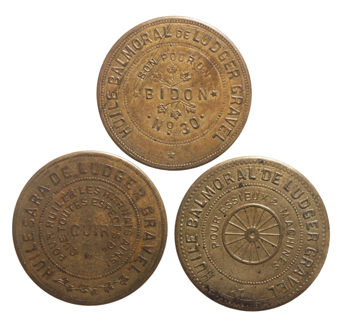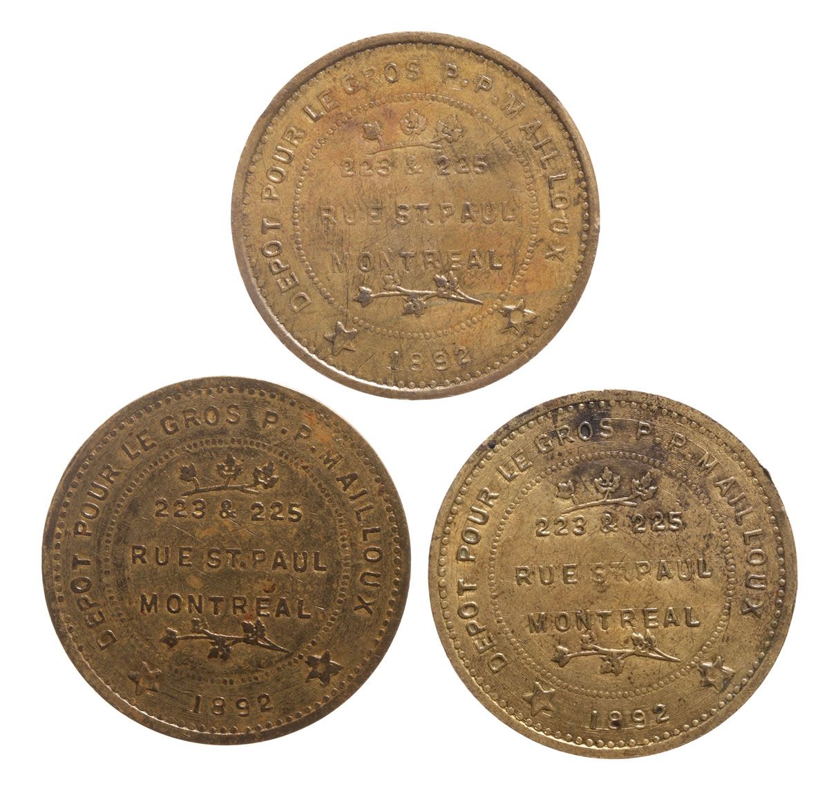 breton tokens, consisting of: Depot pour le gros P.P. Mailloux, Montreal, 1892, Huile Balmoral de Ludger Gravel, Br. 641; Depot pour le gros P.P. Mailloux, Montreal, 1892, Huile Balmoral de Ludger Gravel, Bidon No. 30, Br. 644; Depot pour le gros P.P. Mai