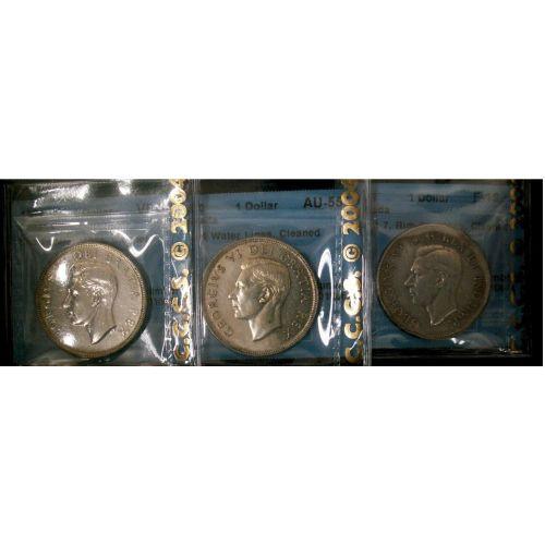 Lot of three CCCS graded Silver dollars; 1947 Blt 7 F-15, edge nicks and cld, 1950 SWL AU-55, cld. 1951 SWL VF-30, cld.