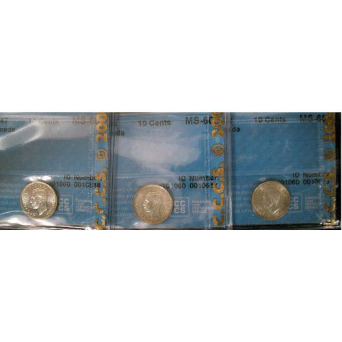 Lot of three CCCS graded Ten cents; 1942, 1946, 1947. All MS-60's