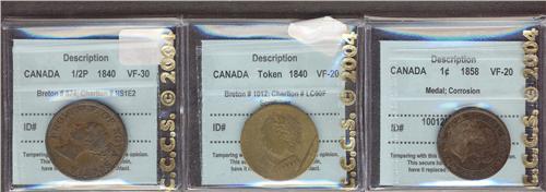 Lot of three CCCS graded coins/tokens. 1858 CCCS VF20 "corrosion", NS-1E2 Breton # 874 1/2p 1840 CCCS VF30, LC-60f Breton# 1012 "scrts" CCCS VF20.