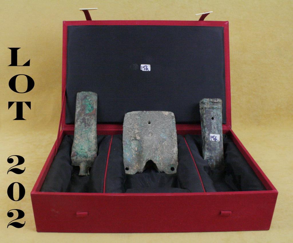 Lot of three Chinese bronze implements circa 1,500-3,000 years old contained in a lined display box with lid. The first implement is an axe head approx. 6-1/2” overall and approx. 1-3/4” wide with uncleaned surface;the second item appears to be a spade-like blade approx. 5” x 4” and also is in uncleaned condition; the third relic is another axe head approx. 5-1/2” overall and 1-1/2” wide. A great opportunity to obtain a small grouping of desirable antiquities. Est.: $750-$1,500.