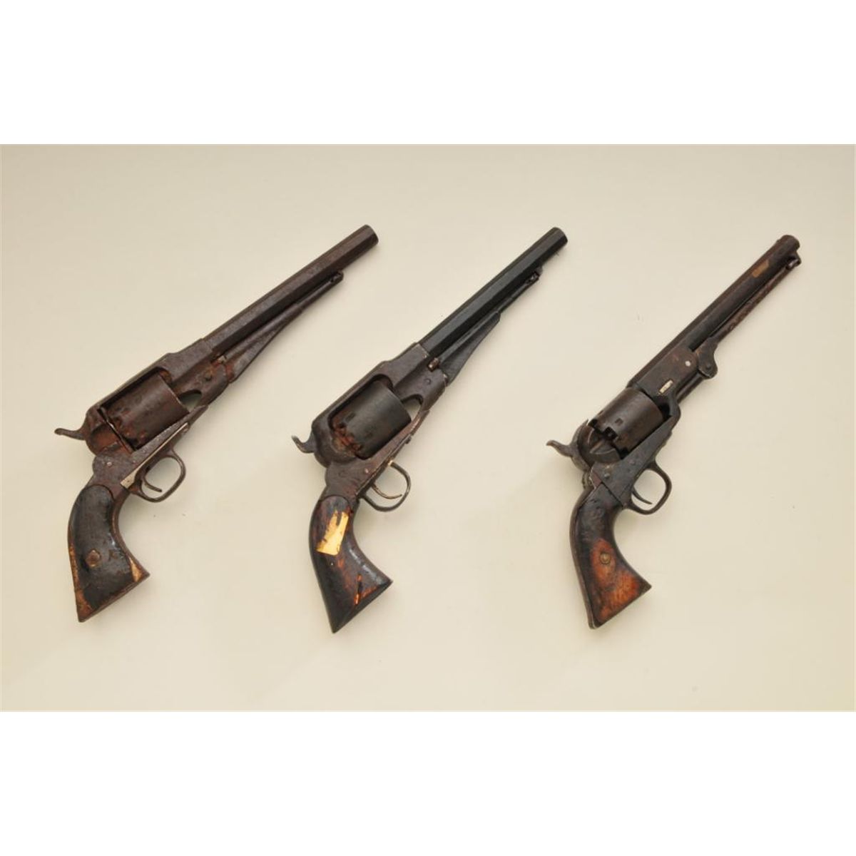 Lot of three Civil War revolvers in relic condition collected by California collector near Haymarket, VA, approx. 40 years ago. Includes: New Model Remington, .44 caliber percussion, with old handmade crudetriggerguard and trigger. Hand-made rough grips, in relic condition; Remington New Model .44 percussion with replaced forged iron guard, rough grips, forged cap shield inserted in rear of frame; Belgian brevettecopy of Colt Navy with iron guard and backstrap. All three pistols have small replaced parts and are not working, in relic condition. Est: $500 - $1,000