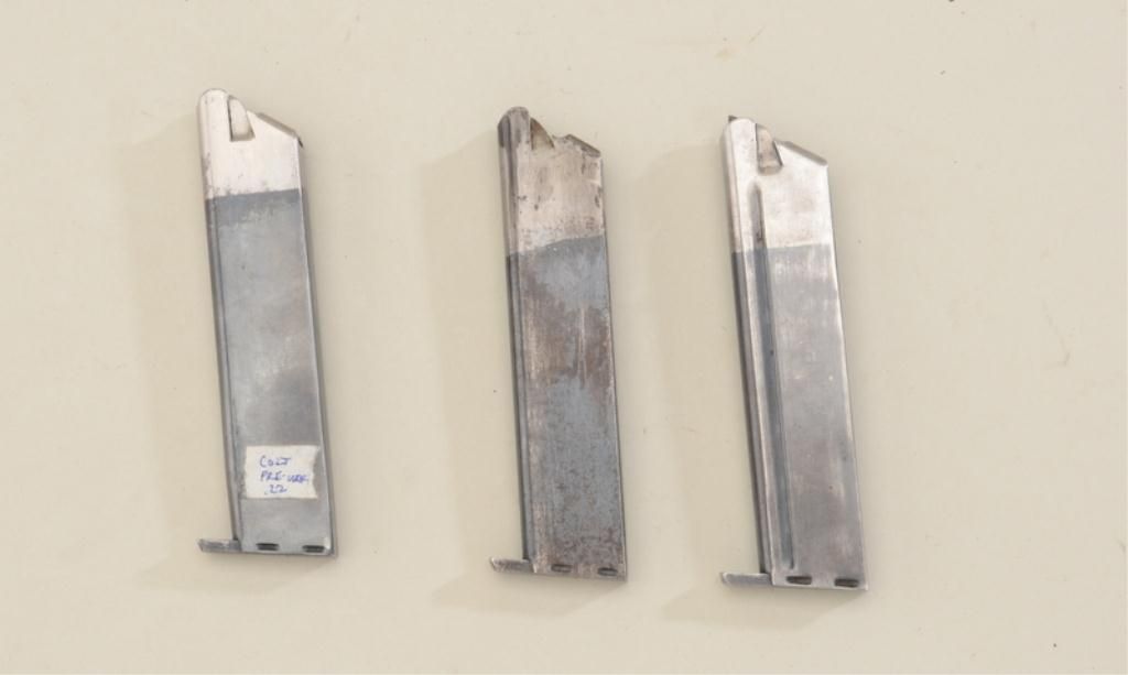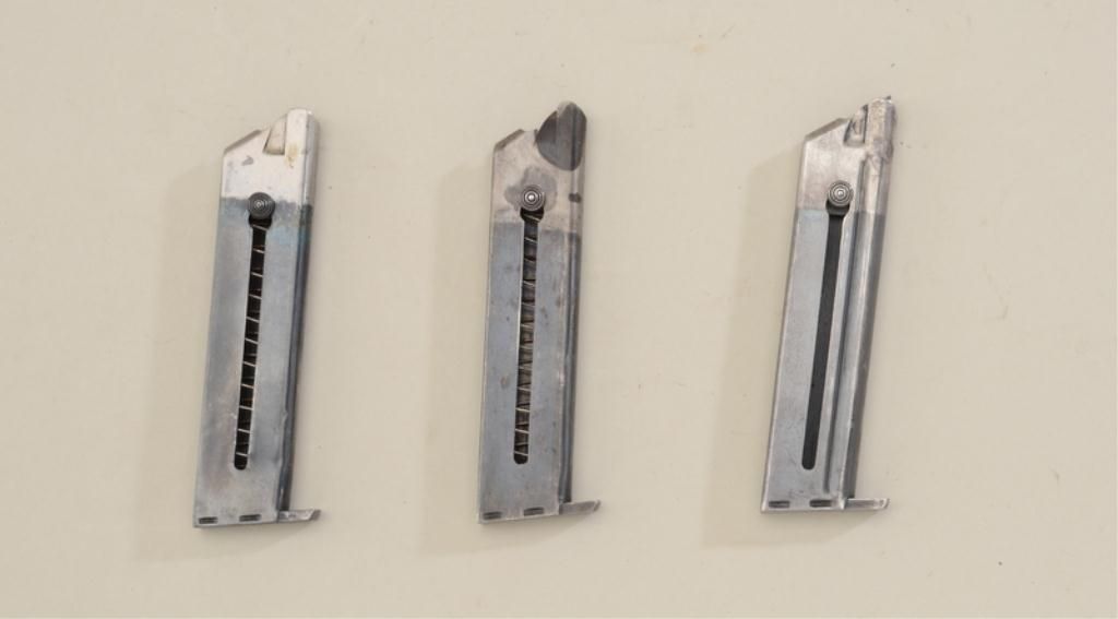 Lot of three Colt .22 caliber semi-auto pistol magazines, all early with the two-tone finish; two are pre-war marked on the bottom of the mag. in two lines: “CAL. 22 COLT”, the other is marked the same but in largerlettering font; all three are in overall good to very good condition with strong internal springs. Est.: $75-$150.