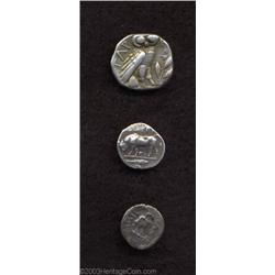 <TABLE cellSpacing=0 cellPadding=0 width="100%" bgColor=#000000 border=0><TBODY> <TR><TD width="100%"><TABLE cellSpacing=1 cellPadding=3 width="100%" border=0><TBODY><TR><TD width="100%" bgColor=#79735c><FONT face=arial color=#ffffff size=3><B>Description</B> </FONT></TD></TR><TR><TD width="100%" bgColor=#ffffff><FONT face=arial size=2><B>Lot of three Greek fractions.</B></I> Includes: Lucania, Thourioi. Triobol. Rutter, <I>HN</B></I> 1777. Near VF // Calabria, Taras. Drachm. Vlasto 1053. Near VF // Uncertain. Diobol? (1.15 g). Athena / Owl on trident. Near Fine. (3 coins) </FONT></TD></TR></TBODY></TABLE></TD></TR></TBODY></TABLE><BR><A name=PricesRealized></A><TABLE cellSpacing=0 cellPadding=0 width="100%" bgColor=#000000 border=0><TBODY><TR><TD width="100%"><TABLE cellSpacing=1 cellPadding=3 width="100%" border=0><TBODY><TR><TD width="100%" bgColor=#79735c><A name=PR><FONT face=arial color=#ffffff size=3><B>Previous Prices from Heritage Auctions</B> </FONT></A></TD></TR><TR><TD bgColor=#f6f6ed>No Prior Data Recorded </TD></TR><TR><TD bgColor=#ffffff><FONT face=arial size=1 ?>PLEASE NOTE: All prices realized reflect the final hammer price PLUS the buyer's premium in auctions that charge a buyer's premium. Each item has a notation at the top of the listing indicating whether that lot included a buyer's premium. Example: A item that sells with a final hammer price of $100 and a 20% buyer's premium will display with a price realized of $120. All information listed is intended to be as accurate as possible, but errors are possible. Please use this guide carefully and inform us of any inaccuracies. </FONT></TD></TR></TBODY></TABLE></TD></TR></TBODY></TABLE><BR><TABLE cellSpacing=0 cellPadding=0 width="100%" bgColor=#000000 border=0><TBODY><TR><TD width="100%"><TABLE cellSpacing=1 cellPadding=3 width="100%" border=0><TBODY><TR><TD width="100%" bgColor=#79735c colSpan=6><FONT face=arial color=#ffffff size=3><B>Price Guide*</B> </FONT></TD></TR><TR bgColor=#f6f6ed><TD align=middle><B>Grade</B> </TD><TD align=middle><B>Coin World<BR>(Trends)</B> </TD><TD align=middle><B>Numismedia<BR>Retail</B> </TD><TD align=middle><B>Numismedia<BR>Wholesale</B> </TD><TD align=middle><B>Coin<BR>Universe</B> </TD><TD align=middle><B>Heritage<BR>Value Index</B> </TD></TR><TR><TD colSpan=6>No Pricing Data Available</TD></TR><TR bgColor=#ffffff><TD colSpan=6><FONT size=1>*All information listed is intended to be as accurate as possible, but errors are possible. No item may be returned or refused based on this information which is provided as a service to our customers. You should contact each pricing source directly to determine the accuracy of this information. </FONT></TD></TR></TBODY></TABLE></TD></TR></TBODY></TABLE><BR><TABLE cellSpacing=0 cellPadding=0 width="100%" bgColor=#000000 border=0><TBODY><TR><TD width="100%"><TABLE cellSpacing=1 cellPadding=3 width="100%" border=0><TBODY><TR><TD width="100%" bgColor=#79735c><FONT face=arial color=#ffffff size=3><B>Population Guide</B> </FONT></TD></TR><TR bgColor=#ffffff><TD ali Important notice: Heritage usually auctions material at the rate of 200-250 lots per hour. On some occasions eBay Live bid software or the Internet may not be able to keep up with the pace of the auction. We recommend placing a realistic absentee bid now as insurance to avoid disappointment. Occasionally the auctioneer may eliminate or reject an eBay Live bid, and the auctioneer may also reopen a lot after the close of the eBay live bidding (usually because we missed an audience bid), and may reject your bid even if it shows you as the winning bidder. By bidding via eBay Live, you agree that Heritage may award the lot to another bidder at its sole discretion under the circumstances described above or any other reasonable circumstances. Also please note that all Heritage lots purchased through eBay Live carry a 20% Buyer's Premium. Please make sure you read the Terms and Conditions before you bid.</TD></TR></TBODY></TABLE></TD></TR></TBODY></TABLE>