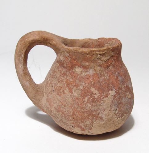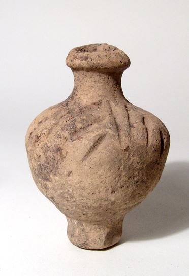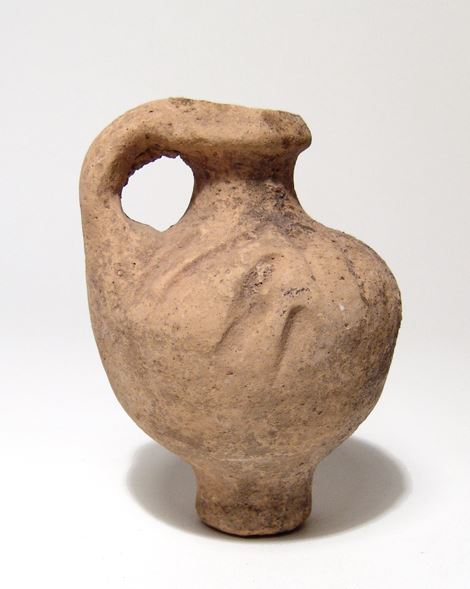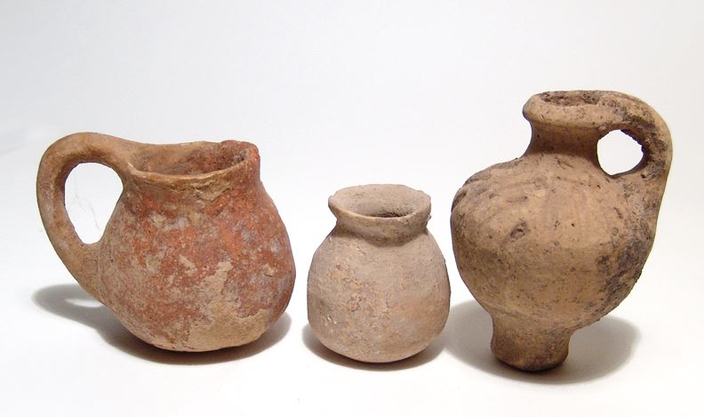Lot of three Holy Land vessels. Lot includes a small Bronze Age handled cup, c. 3000 - 2500 BC, a small Iron Age vase, c. 1200 - 800 BC, and a Roman juglet, c. 3rd - 4th Century AD, with incised shoulders. Sizes from 21/4 in to 3 3/4 in (5.7 to 9.5 cm). Ex Los Angeles private collection.