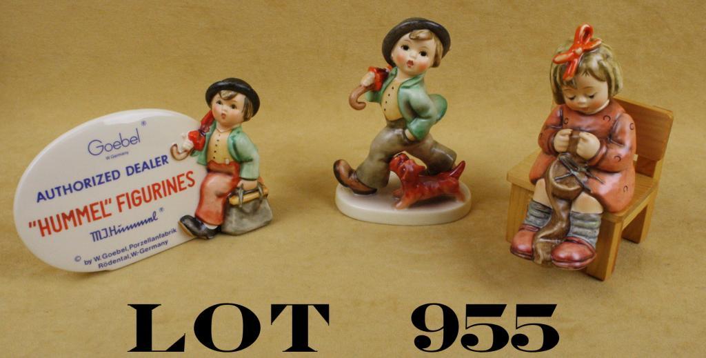 Lot of three Hummel figurines by Goebel, two in factory boxes, all in excellent condition at time of description including one of a little school girls and wood school desk, one of a little boy and his dog walking with aclosed umbrella (both of these in boxes) and an authorized dealer “Hummel” Figurines” showcase advertiser in excellent condition. Est.: $100-$200.