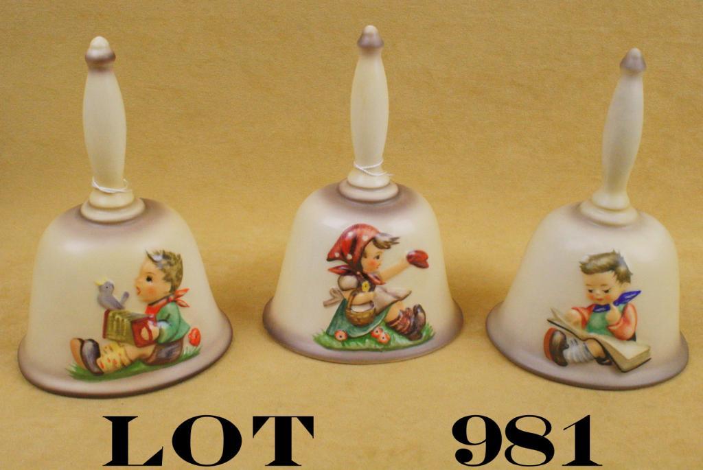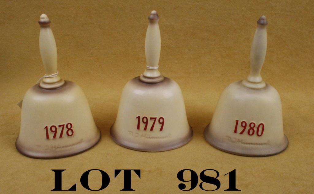 Lot of three Hummel porcelain bells in their original factory cardboard boxes including the 1980 Annual Bell in bas-relief, Third Edition by Goebel; the 1978 First Edition by Goebel Annual Bell in bas-relief and the 1979 Annual Bell in bas-relief, Second Edition by Goebel, all in excellent condition at time of description. Est.: $150-$250.