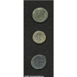 <B>Lot of three Julio-Claudius bronzes.</B></I> Includes: Germanicus. Issued under Claudius. VF, fields smoothed // Drusus. Restitution issue of Titus. Good VF, rough patina // Nero. Dupondius. VF. 3 coins <BR><BR><B>Important notice:</B> Heritage usually auctions material at the rate of 200-250 lots per hour. On some occasions eBay Live bid software or the Internet may not be able to keep up with the pace of the auction. We recommend placing a realistic absentee bid now as insurance to avoid disappointment. Occasionally the auctioneer may eliminate or reject an eBay Live bid, and the auctioneer may also reopen a lot after the close of the eBay live bidding (usually because we missed an audience bid), and may reject your bid even if it shows you as the winning bidder. By bidding via eBay Live, you agree that Heritage may award the lot to another bidder at its sole discretion under the circumstances described above or any other reasonable circumstances. Since eBay bids are not shown to us until we open the lot on the floor, we treat those bids just like floor bids. In most cases the floor responds before the eBay bid is presented to us, due to Internet lag time, so for consistency we have made it a policy that floor bids are always considered first over tie eBay live bids. Also please note that all Heritage lots purchased through eBay Live carry a 20% Buyer's Premium. Please make sure you read the Terms and Conditions before you bid.
