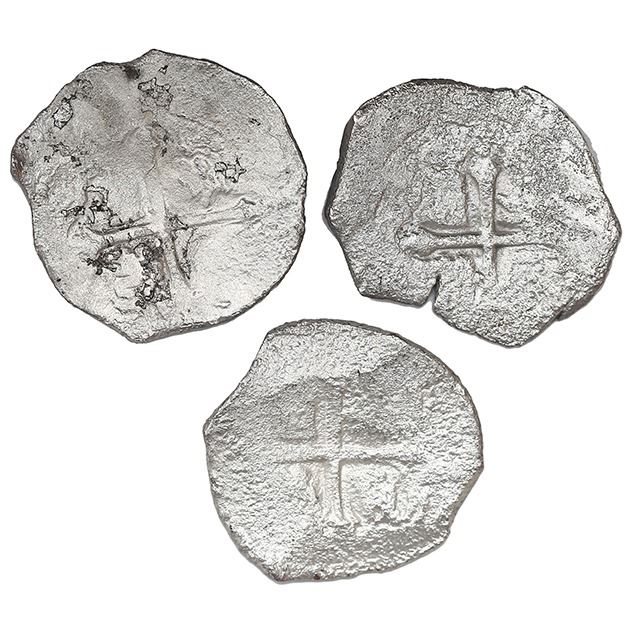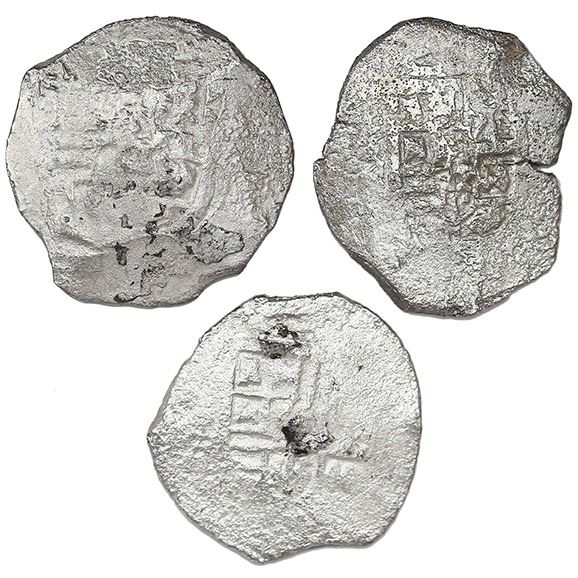 Lot of three Mexico City, Mexico, cob 4 reales, Philip IV, assayers not visible. KM-38. 34.49 grams total. All solid and silvery with plenty of detail, rather nice crosses on a few. Recovered from: Concepcion, sunk in 1641 off Hispaniola