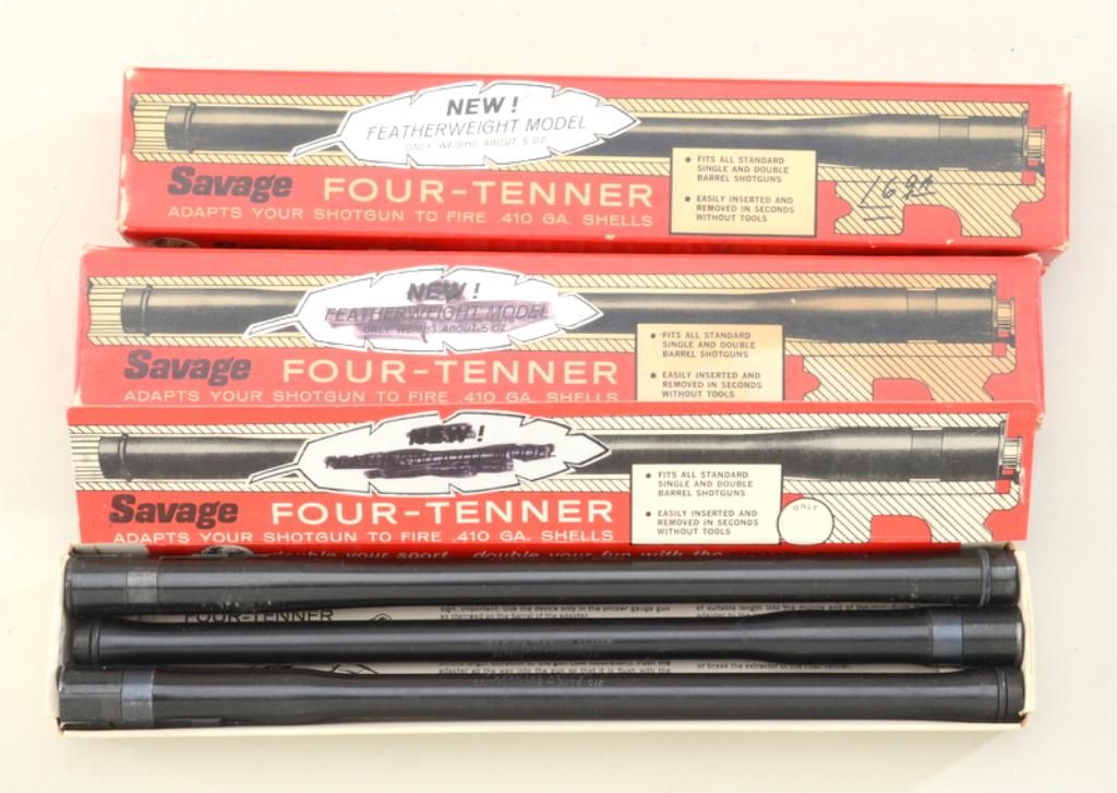 Lot of three Savage “Four-Tenner shotgun gauge adapters in their original factory cardboard boxes; one marked adapting for a 12 gauge, one for a 16 gauge and another marked “12/20”. Est.: $25-$50.