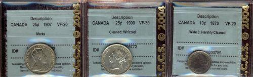 Lot of three Ten cents, all CCCS graded with comments, 1870 VF20 Wd 0 Harshly cleaned, 1900 25¢ VF30 Whizzed and 1907 25¢ VF20 Marks.