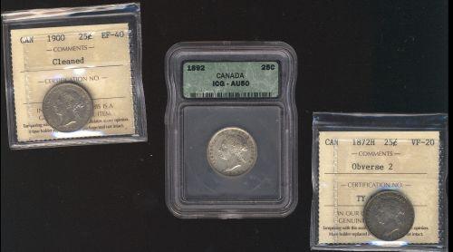 Lot of three "Third party graded coins". 1872H Obverse#2 ICCS VF-20, 1892 ICG AU-50, 1900 ICCS EF-40 lightly cleaned.